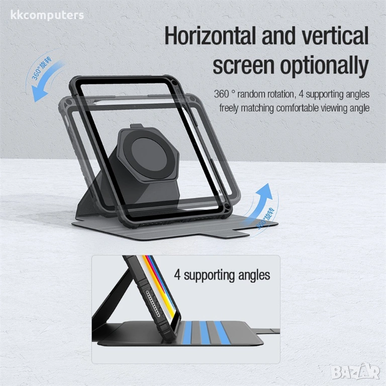 Вградените магнити поддържат функция Auto Wake/Sleep, която автоматично включва и изключва екрана при отваряне и затваряне на калъфа, спомагайки за по-дълъг живот на батерията. Допълнителната защита при изпускане се осигурява от въздушни възглавници в ъглите и повдигната рамка около ръбовете на таблета.
