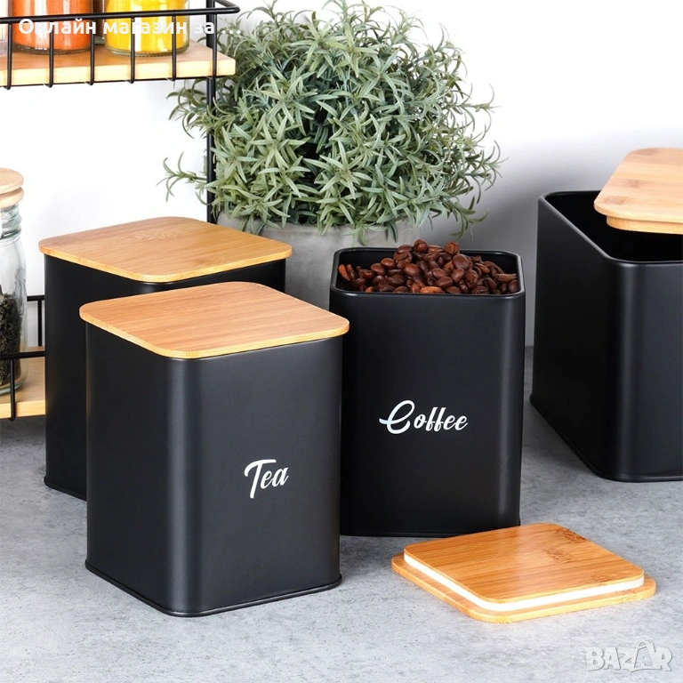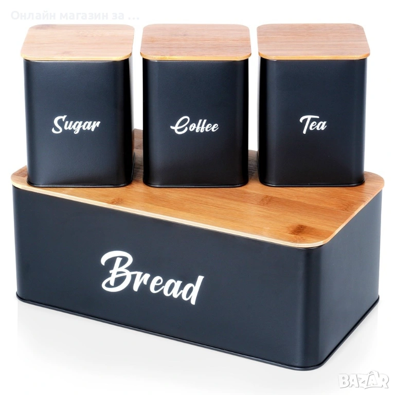 Комплект кутия за хляб и 3 буркани за съхранение на кафе, чай и захар, 259627