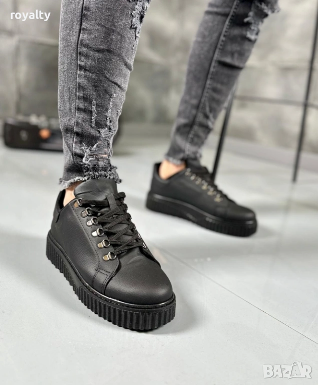 Моделът BRONX DARK комбинира устойчива черна еко кожа с дълбока черна оребрена подметка, придаваща обем и стабилност.