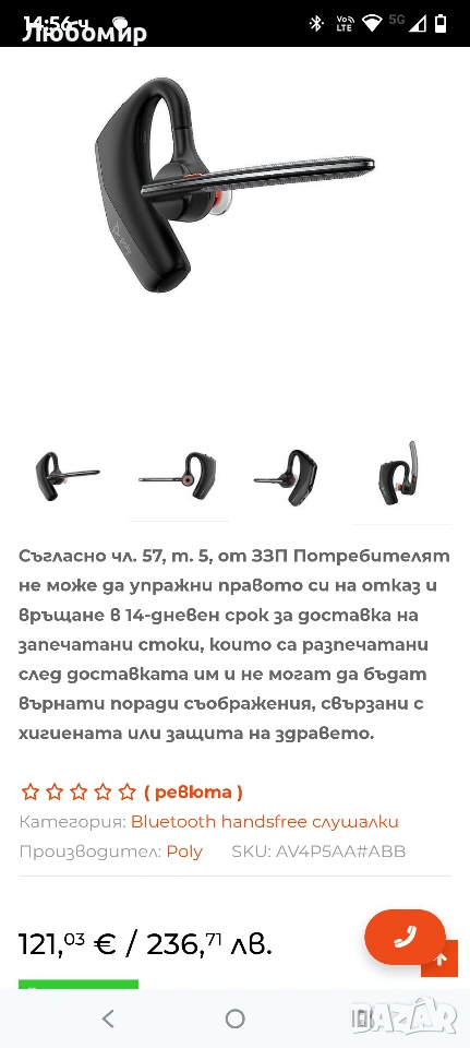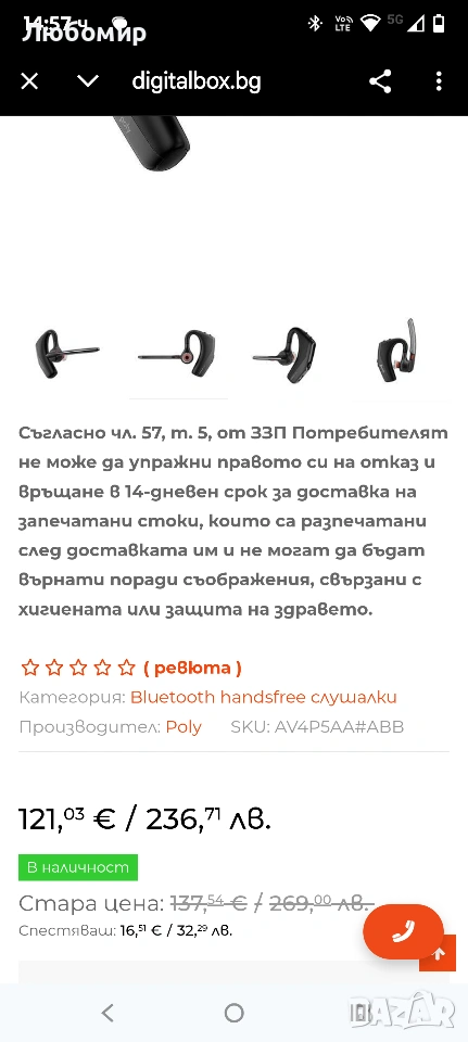 Гласови сигнали: Заглушен звук; Входящо повикване; Състояние на батерията;