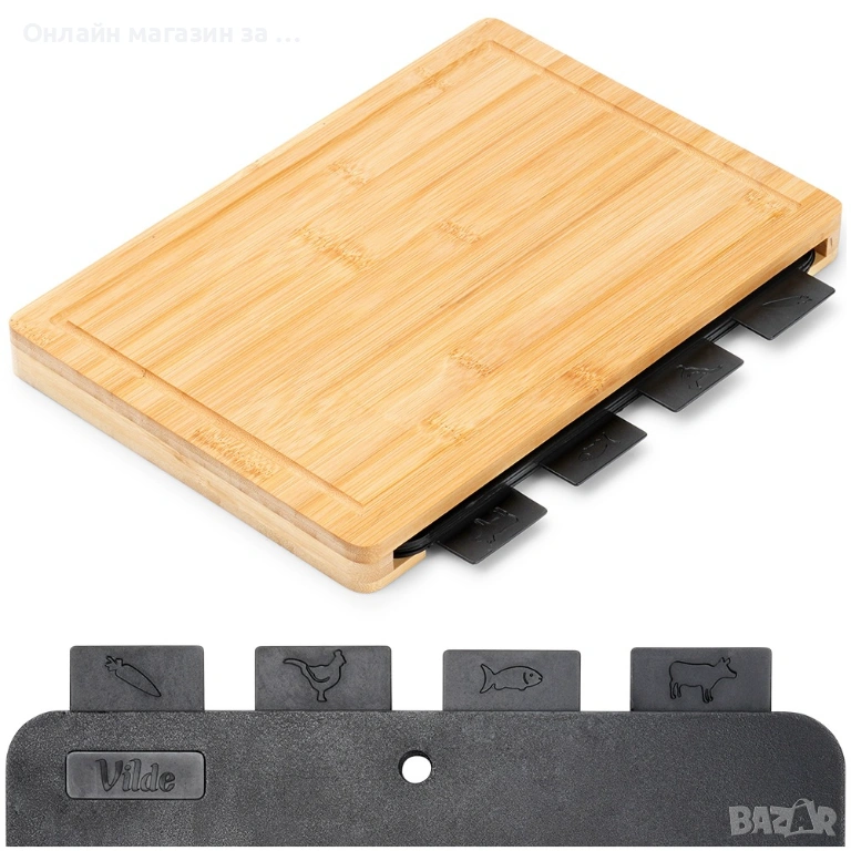 - Комплект от 5 дъски за рязане - Комплект от пет кухненски дъски, включително една, която служи и като стойка. Комплектът включва: 4 дъски с размери 29,5 x 21,5 cm и 1 дъска, която служи и като стойка с размери 33 x 23,5 x 4 cm. Дъските, поставени в стойката, са с размери 33 x 25 x 3 cm. Практично и естетично решение, което улеснява организацията в кухнята.