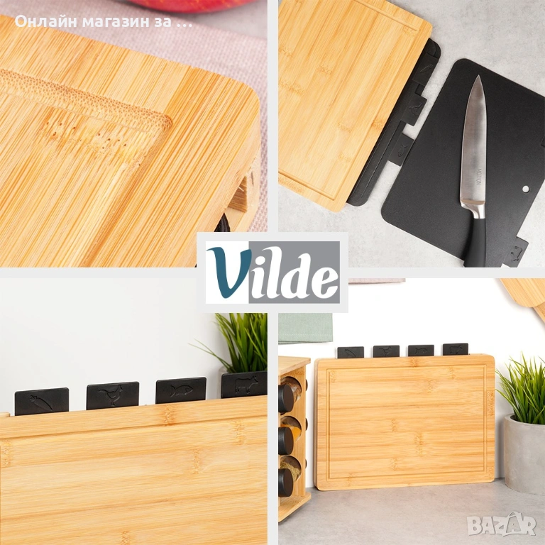 Комплектът дъски за рязане е функционално и естетично решение за всяка кухня. Практичните маркировки и удобните опции за съхранение улесняват ежедневната подготовка на храната. Стойката помага да се избегне разхвърлянето. Тази форма на съхранение на дъските позволява подходяща организация на кухненското пространство, а дъските винаги ще бъдат на мястото си. Комплектът дъски е и чудесна идея за подарък. Класическият дизайн и цветовата гама правят комплекта подходящ за всяка кухня. Оригинален продукт на Vilde. Произведен в съответствие с европейските стандарти.
