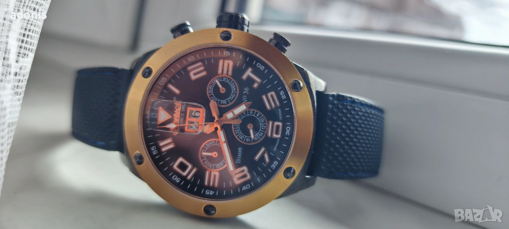 Ingersol bison 36 automatic mechanical watch. Big central date cyclop window. Authentic and original. Напълно оригинален и автентичен, автоматичен, механичен часовник Ингерсол. Отлично състояние, много запазен. Изправно работещ и функциониращ. Показания ден, дата, час, месец, 24 часа денонощие. Централна голяма дата с цикличен прозорец. В комплект с кутия и документи. Реални снимки.