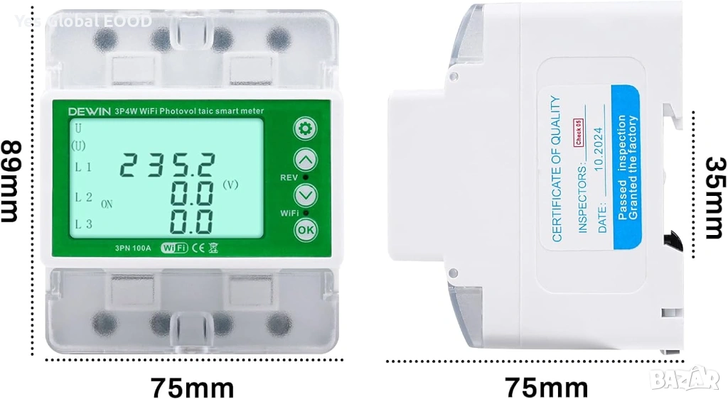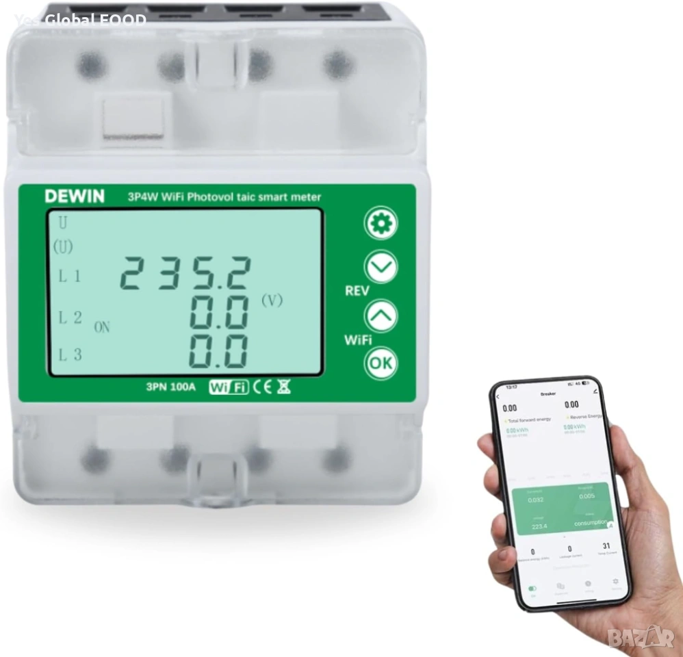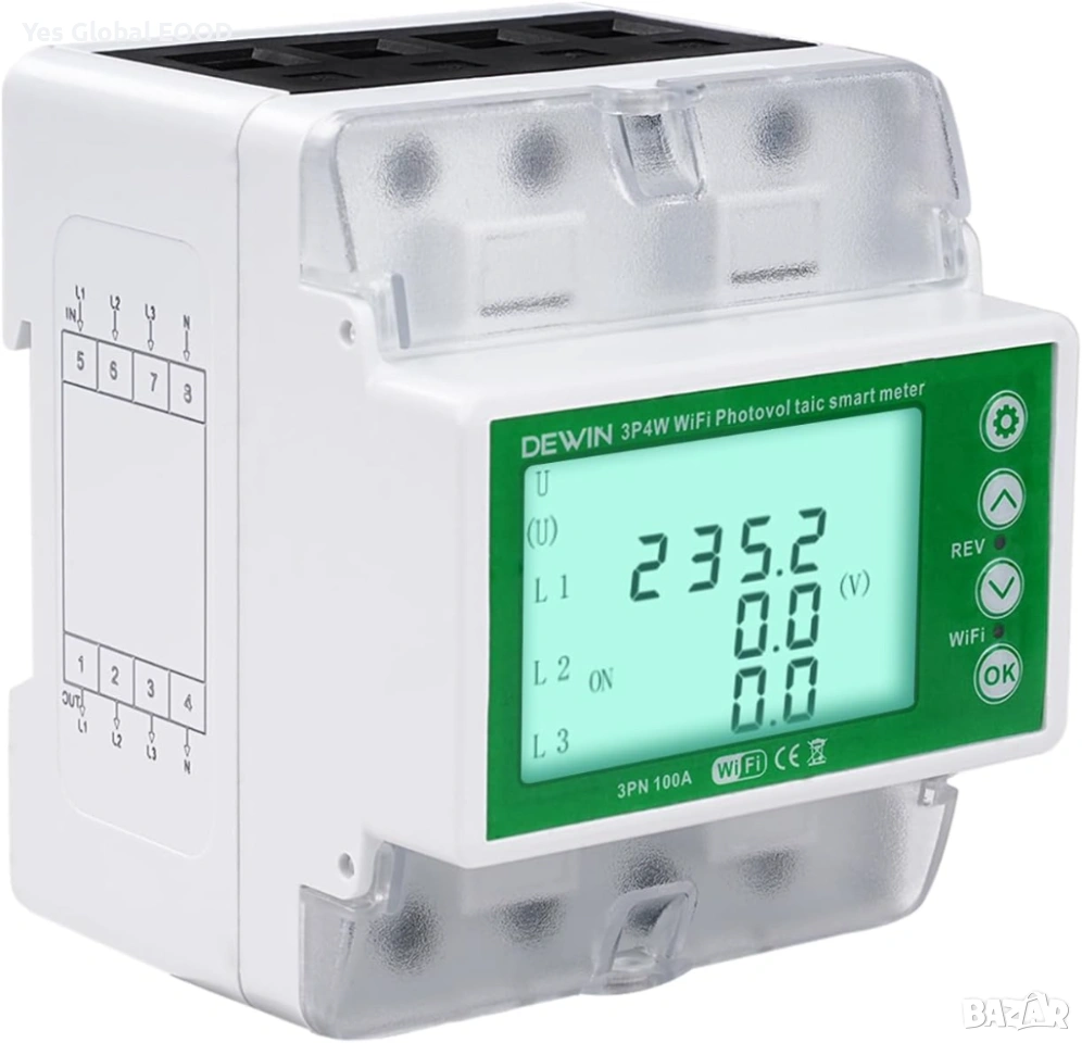 DEWIN WiFi трифазният електромер е предназначен за измерване и мониторинг на електроенергия в трифазни системи 380 VAC. Устройството поддържа безжично WiFi свързване за дистанционно наблюдение на консумацията в реално време. Разполага с функции за защита и контрол, включително засичане на дисбаланс на напрежението, липса на фаза и защита от претоварване с регулируемо закъснение. Подходящ е за промишлени, търговски и домашни инсталации.