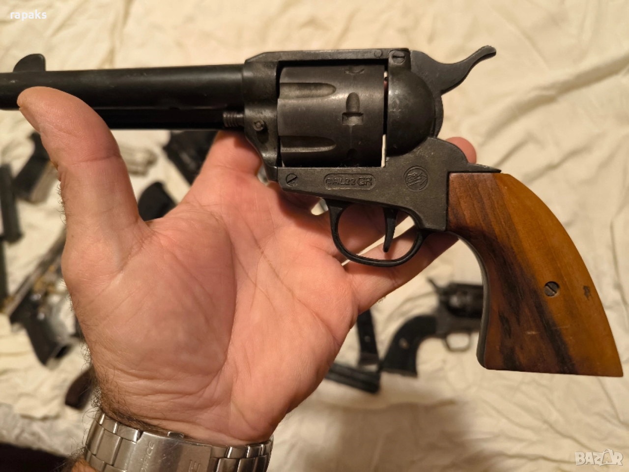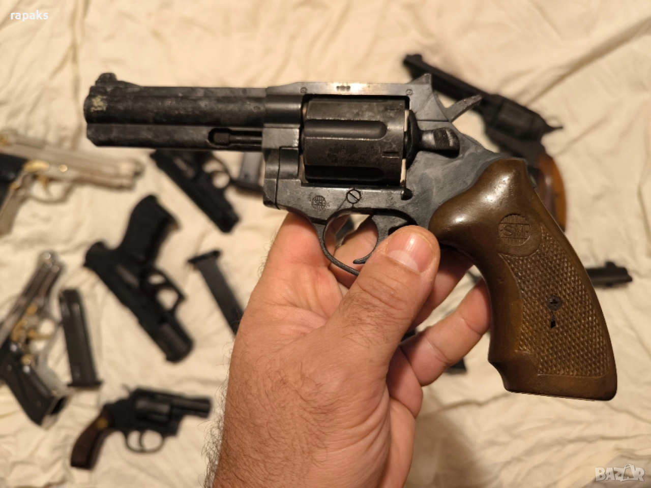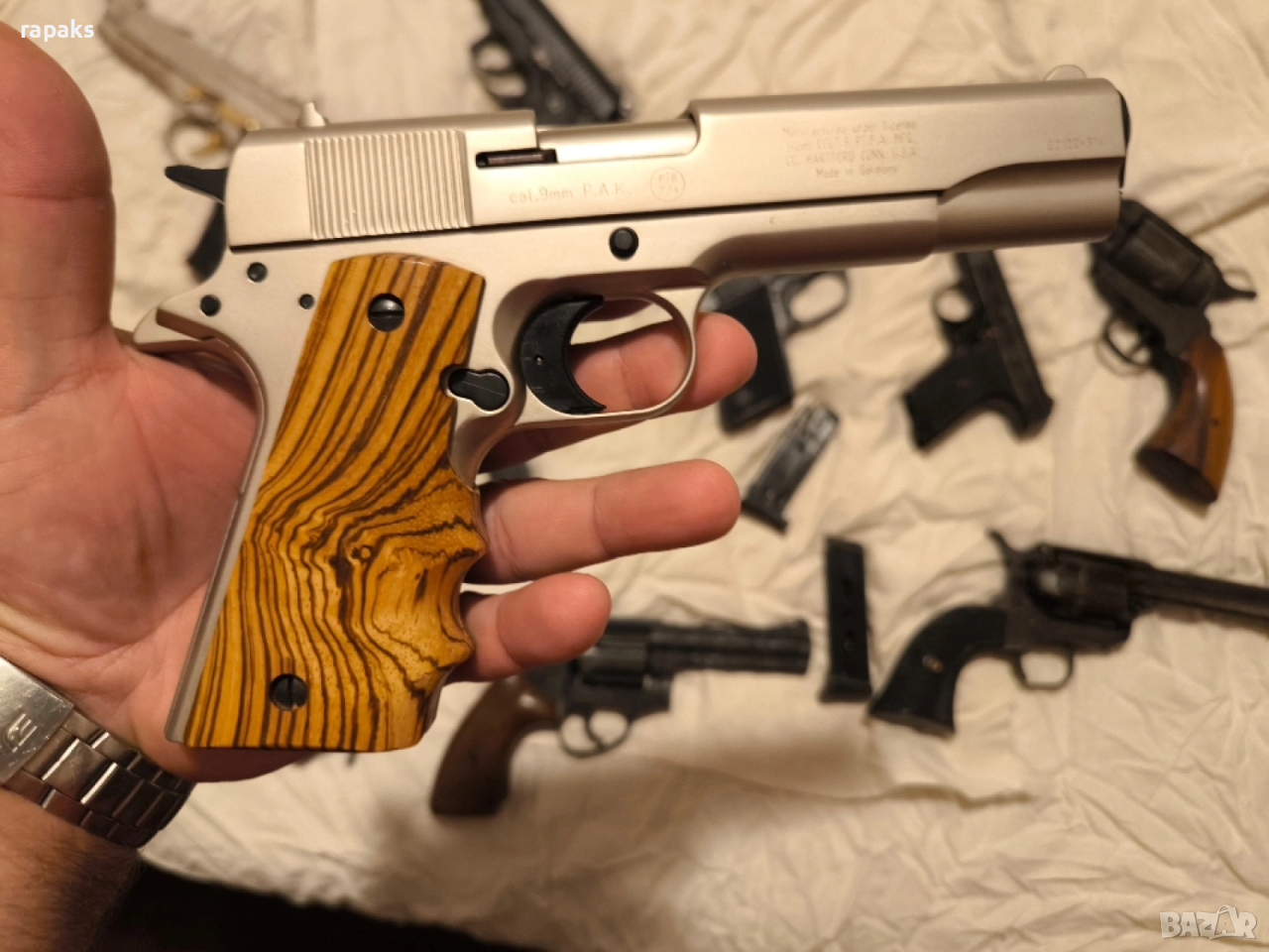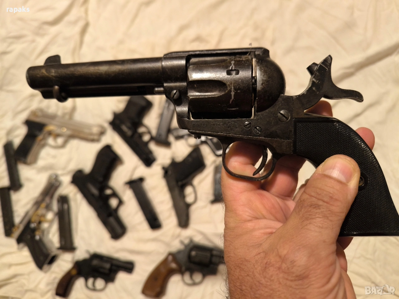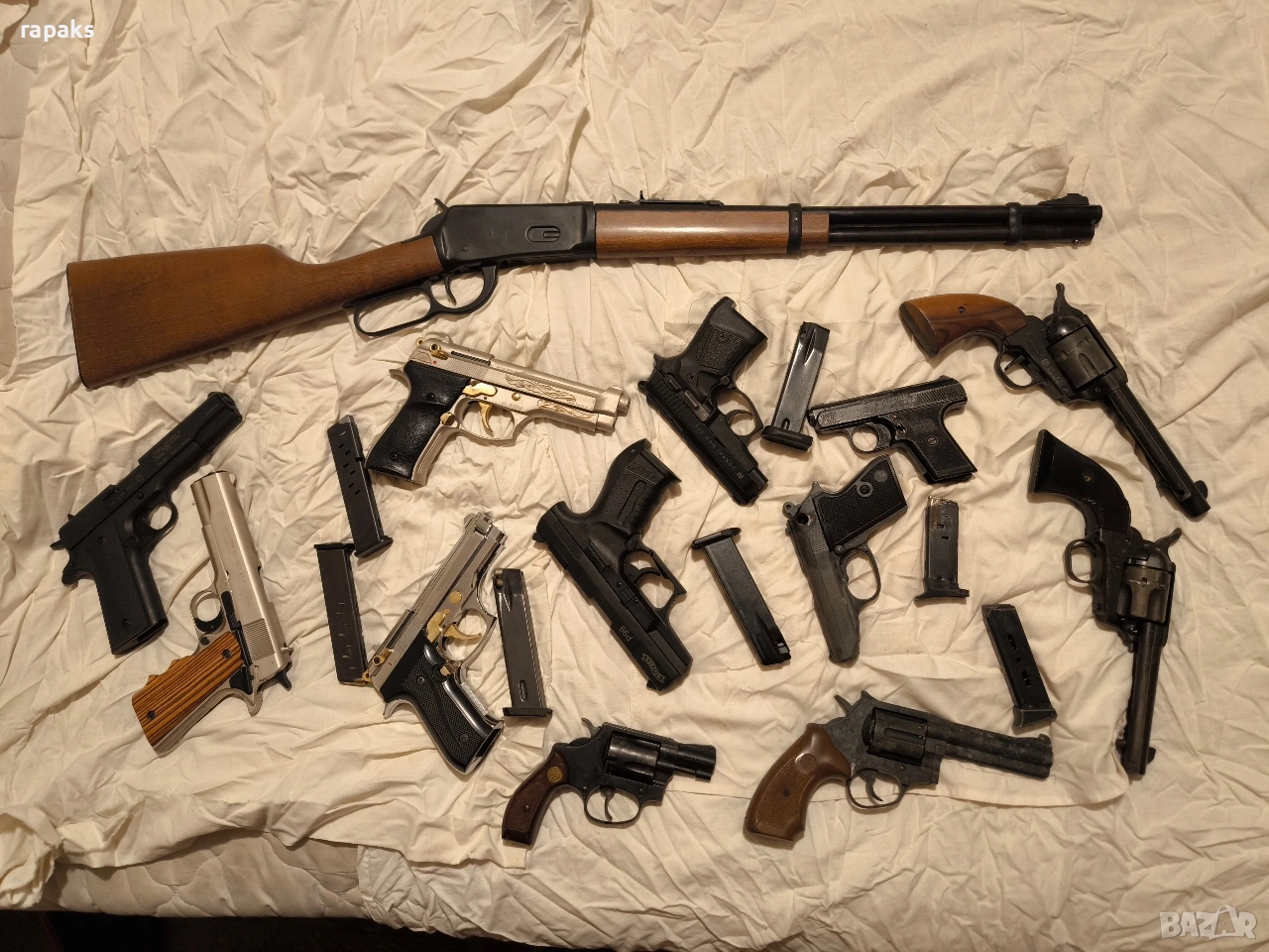 револвери колт, пушка Уинчистер, пистолети колт, Валтер, зораки, Берета и др. Почти всички работят и са в прекрасен външен вид и състояние. Някои дори аз съм купувал скъпо за това и цената на някой може да ви се стори солена, но" кеф цена няма. "