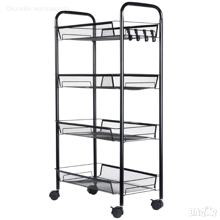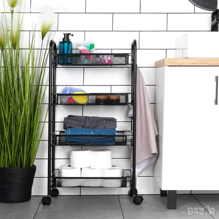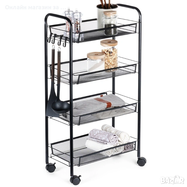 - 4-степенна етажерка - Практична, мобилна етажерка с четири нива за съхранение. Етажерката е с размери 44 x 26 x 84 cm и е оборудвана с четири кошници с размери 40,5 x 26 cm всяка.