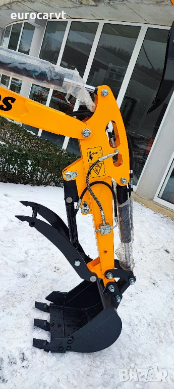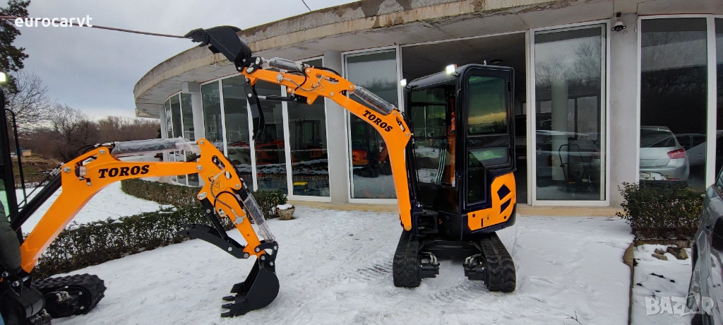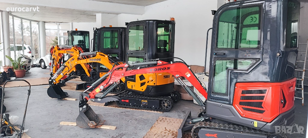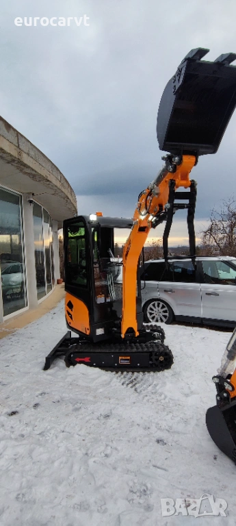 2000кг. с кабина, управление с джойстици, чупеща стрела, гребло, хидравличен палец, парно, кофа 40 см, двоен хидравличен изход за управление на хидравличен инвентар, три цилиндров дизелов двигател Кубота (Kubota D902 engine euro 5 ) с водно охлаждане 11,8kw. CE сертификат, гумени вериги ***ЧИСТО НОВ*** 01/2026г.