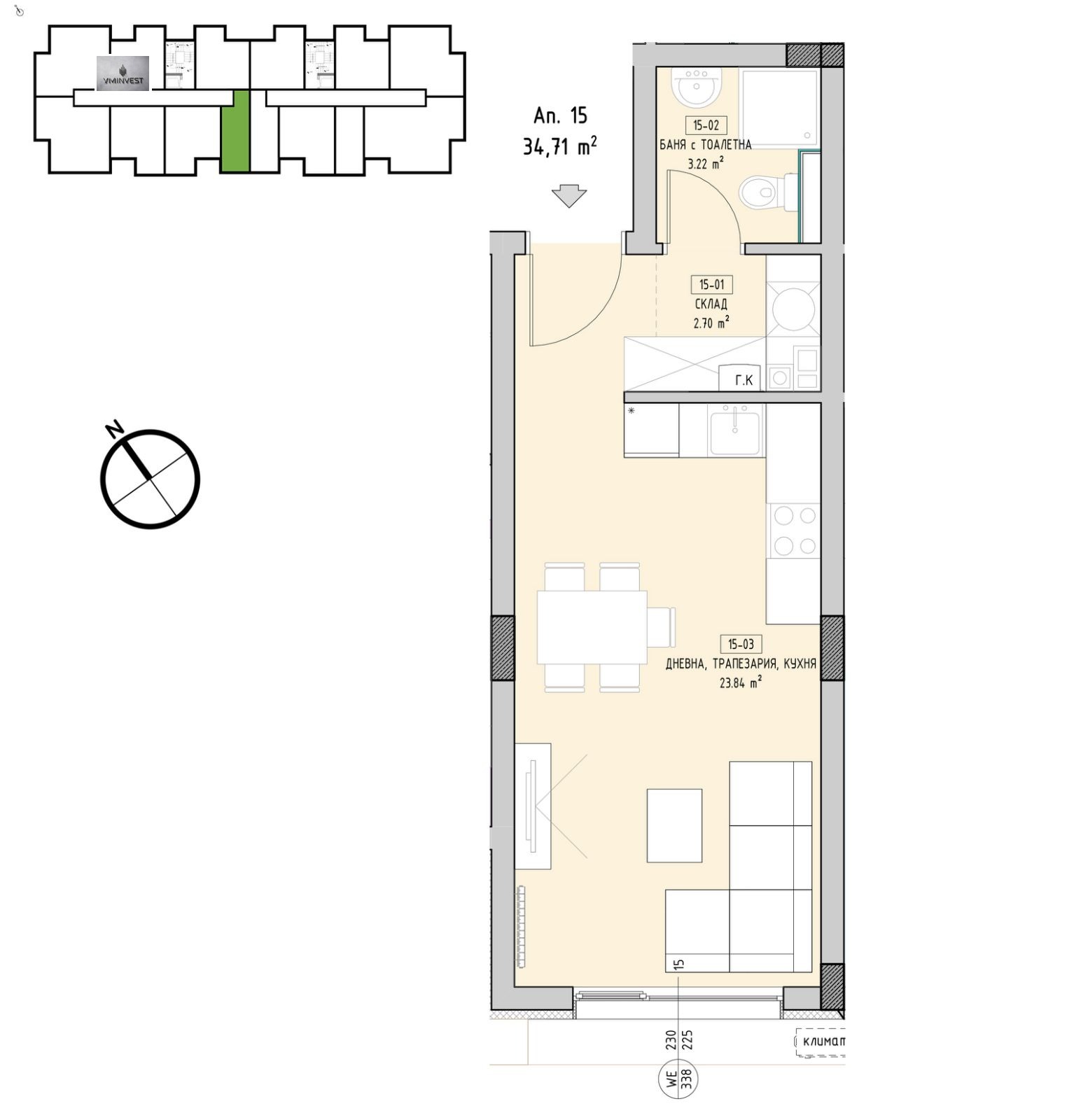 Разпределение: дневна с кухненски бокс /23,84 кв.м./, склад /2,70 кв.м./, баня тоалетна /3,22 кв.м./.