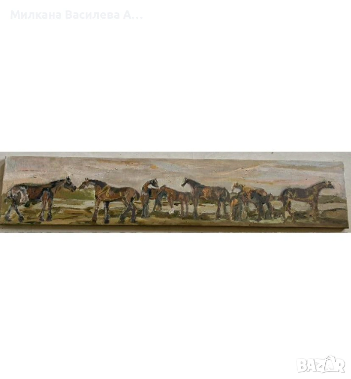 Панорамна композиция с девет пасащи коня на свобода. Издължен формат, подходящ за интериор с дълга стена – хол, кабинет или офис.
