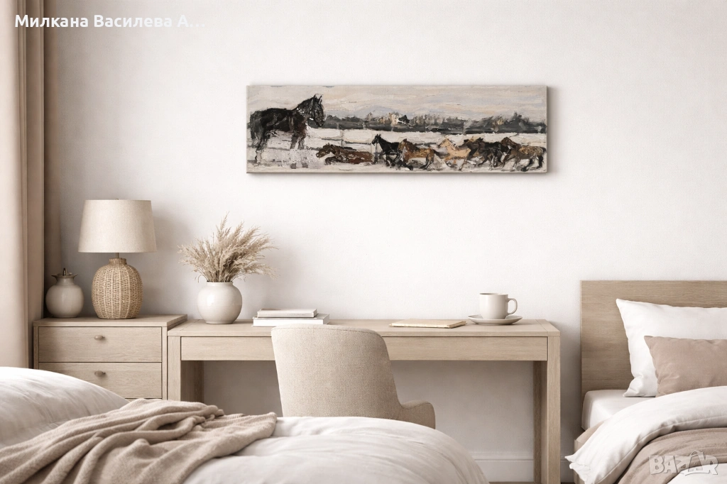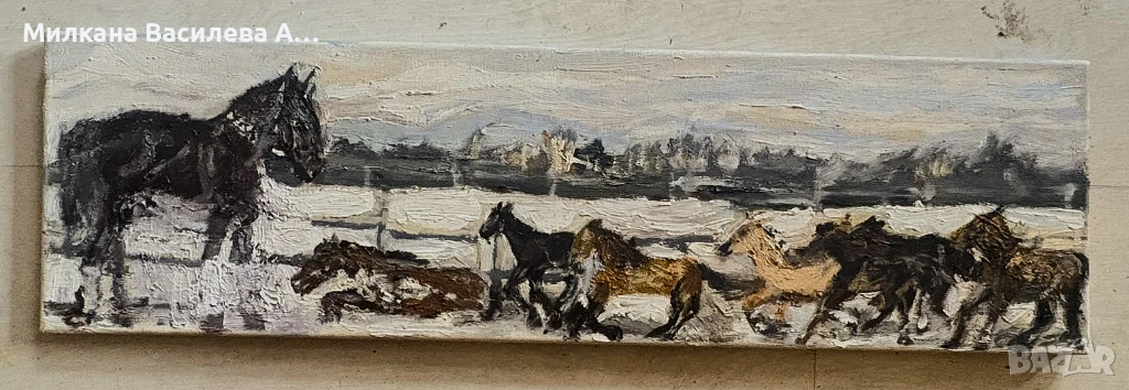 Експресивна композиция със стадо коне в зимен пейзаж. Централният кон – Гаризуп от породата Akhal-Teke – е изобразен като силен и доминиращ акцент. Динамични мазки и живо движение.