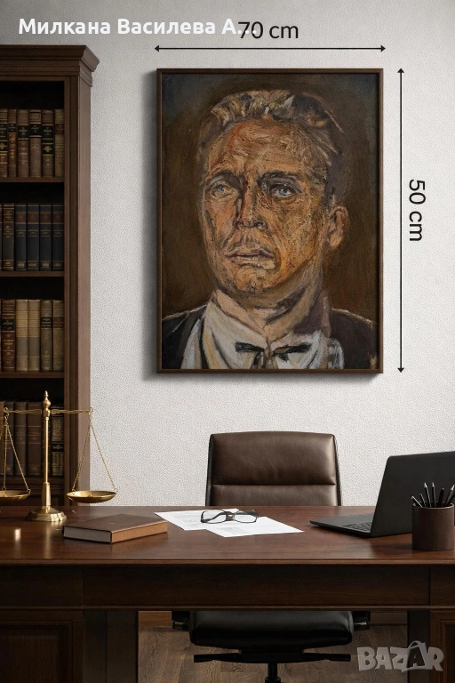 Класически портрет на Васил Левски – Апостола на свободата. Изобразен с решителен поглед и силно присъствие, символ на саможертва и национален дух.