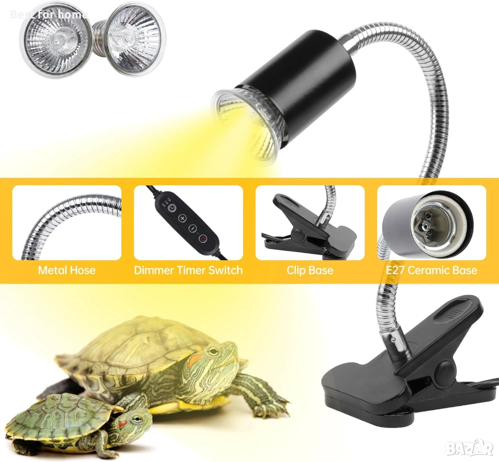 Лампа за греене за терариум (таймер за цикъл), лампа за костенурка UVA UVB нагревателни крушки - 2 броя 50W или 2 бр крушки по 75 вата , въртяща се на 360° UVA/UVB нагревателна крушка за гущер, гекони, змии и др.