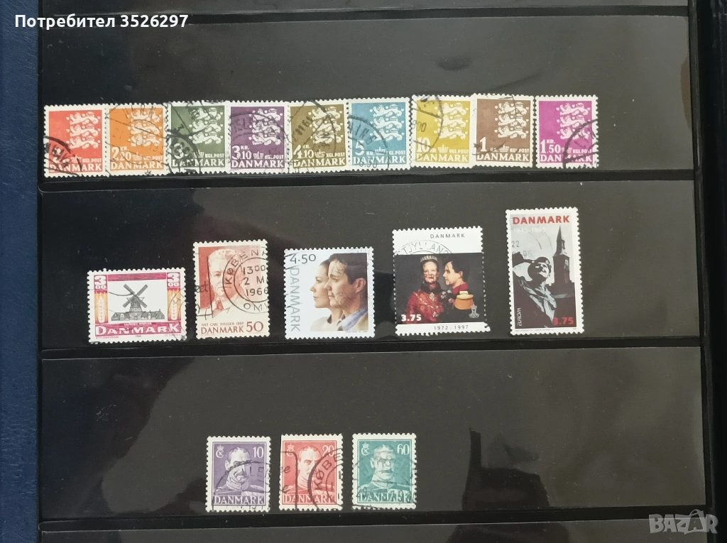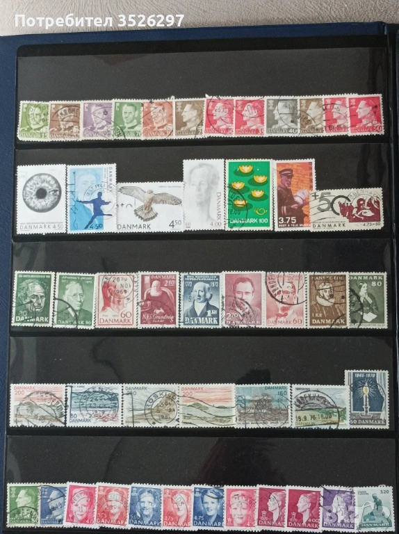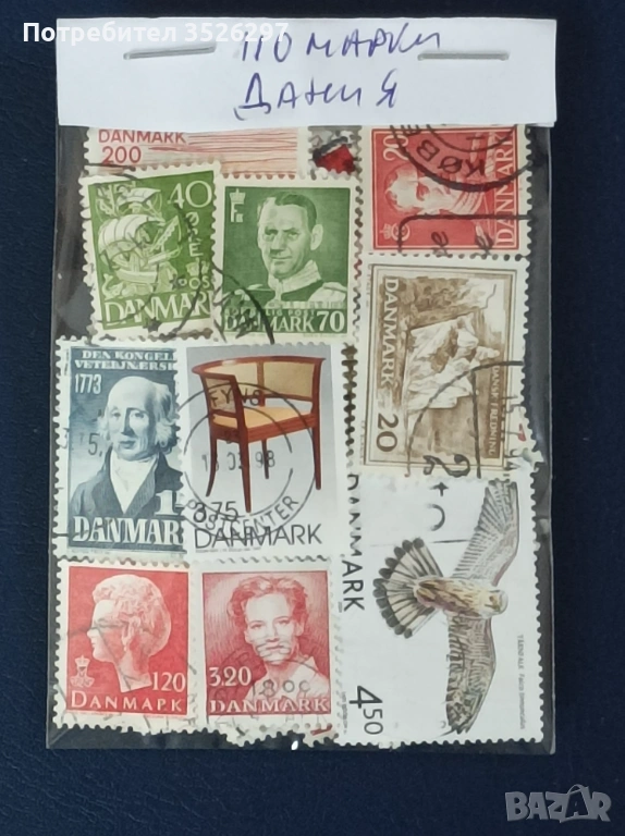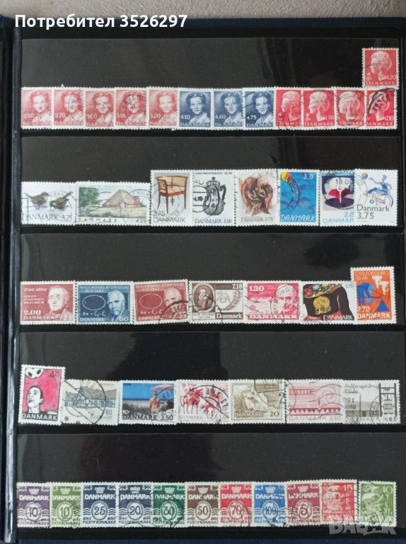 Пощенски марки 110 броя от Дания от 1948г. до днешни дни. Марките са с печати и са тези от снимките за 6 евро.