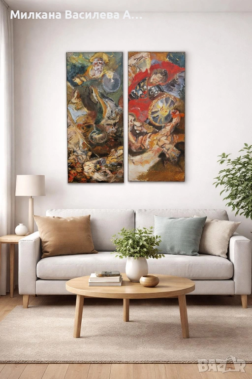 Експресивен диптих, изобразяващ митичната битка между ангели и демони. Изрисуван с динамични мазки и силни контрасти, които създават усещане за движение и драматизъм.