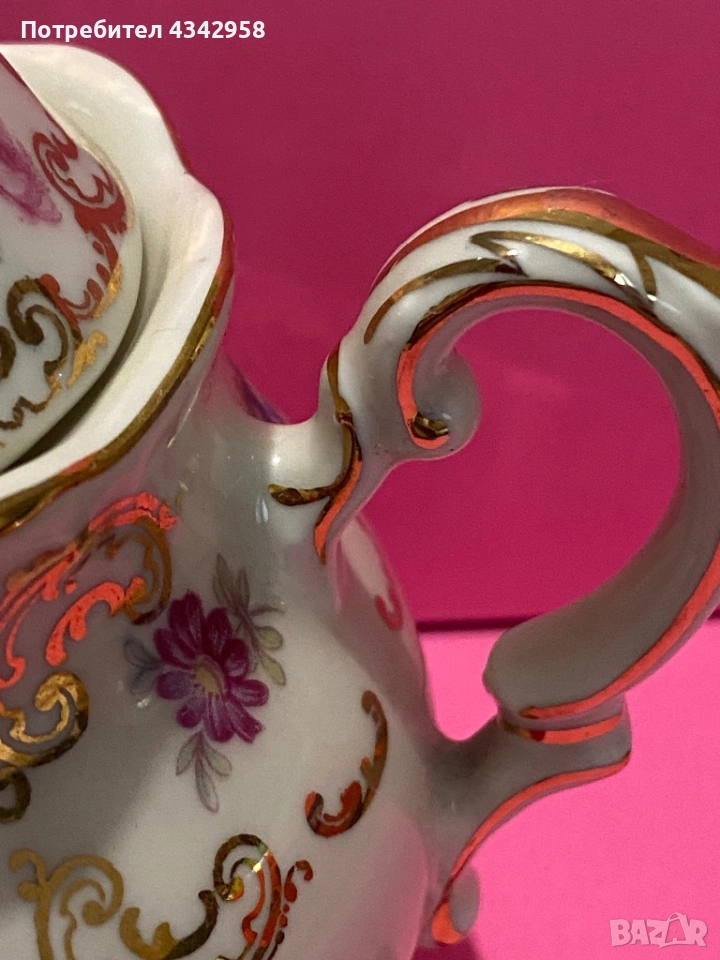 Изработена от фин баварски порцелан, с ръчно рисувана флорална декорация и богато златно орнаментиране. Класическа форма с две дръжки и капак – част от чаен или кафеен сервиз.