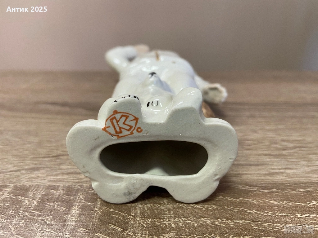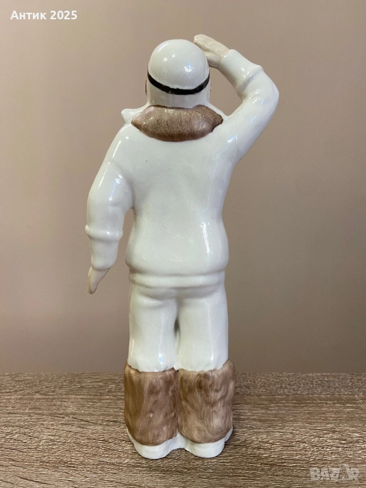 Винтидж порцеланова статуетка, произведена в Коростенския порцеланов завод. Композицията изобразява полярен летец в топло яке и шлем, с вдигната ръка, до седящо бяло меченце – символ на Арктика, усвояването на Севера и романтиката на съветската епоха.