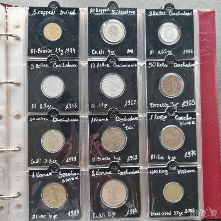Цялостна колекция от 180 броя монети, подредени в красив, кожен колекционерски албум "KaBe - numis junior". Албумът съдържа 15 листа и включва монети преди приемането на еврото в Европа, както и световни монети. Всички монети са в черни специализирани нумизматични картончета с надпис и подредба на държава, година, номинал. Монетите са в добро до много добро състояние, част от тях нециркулирали. Атрактивна цена за готова колекция. Спъсък на монетите по страници: