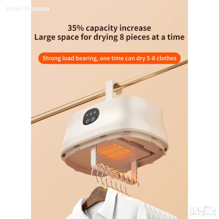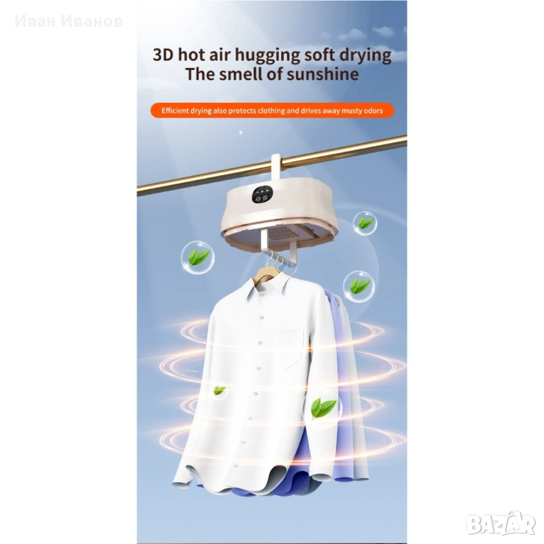 Работи с PTC нагревателна технология, която осигурява равномерна температура, защита от прегряване и запазване на тъканите без намачкване. Лесно се сгъва, не изисква монтаж и има голям вътрешен обем, позволяващ сушене на 5–8 дрехи едновременно.