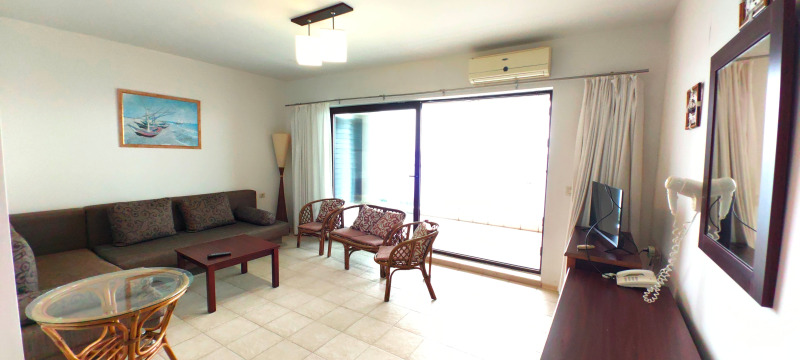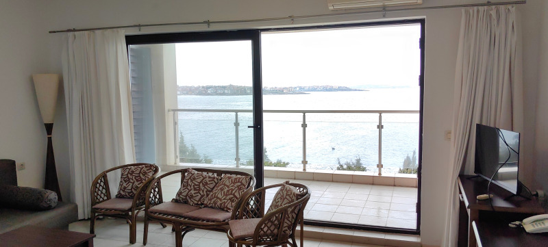 първа линия море в гр. Созопол с невероятен изглед към морския бряг и стария град на Созопол. Имотът е част от луксозен комплекс, изграден в местността Буджака . Жилището е с площ от 64 кв.м. и се състои от всекидневна с кухненски бокс, спалня, коридор, баня с WC и панорамна тераса. Апартаментът е разположен на втори жилищен етаж от сграда и гарантира неповторим морски изглед. Сградата функционира като апартхотел с осигурена денонощна охрана, ресторант, басейни, зацветен и озеленен двор. Имотът се предлага във вида, в който е на снимките, с всички налични мебели и уреди, които са в отлично състояние. При покупка на апартамента имате възможност да го отдавате под наем, като мениджмънта му може да бъде поет изцяло от управата на комплекса.