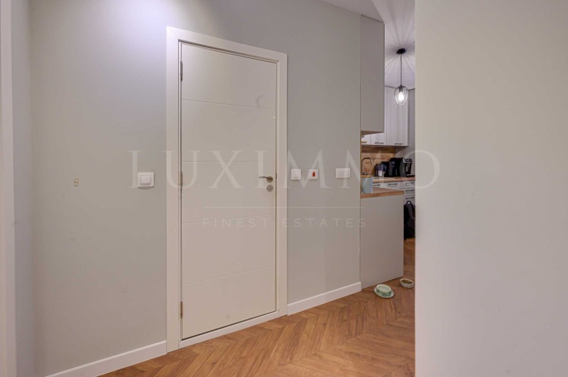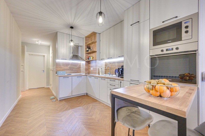Апартаментът разполага със светла дневна зона, която естествено обединява място за отдих и хранене. Интериорът е решен в топли, спокойни тонове, допълнени от естествени дървесни елементи, които придават усещане за уют и легантност.