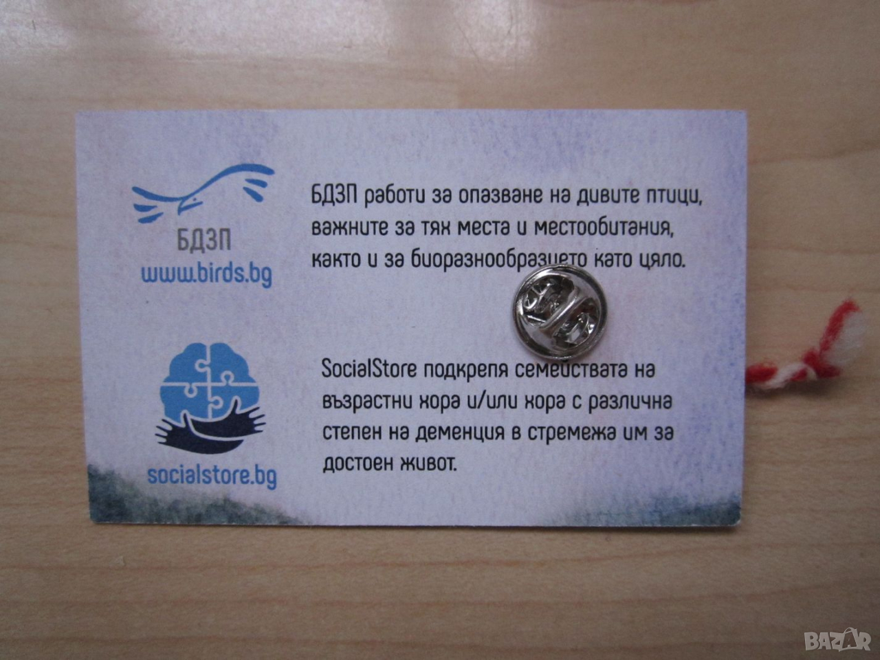 Мартеница от Българското дружество за защита на птиците (БДЗП), с метална значка: пчелояд.
