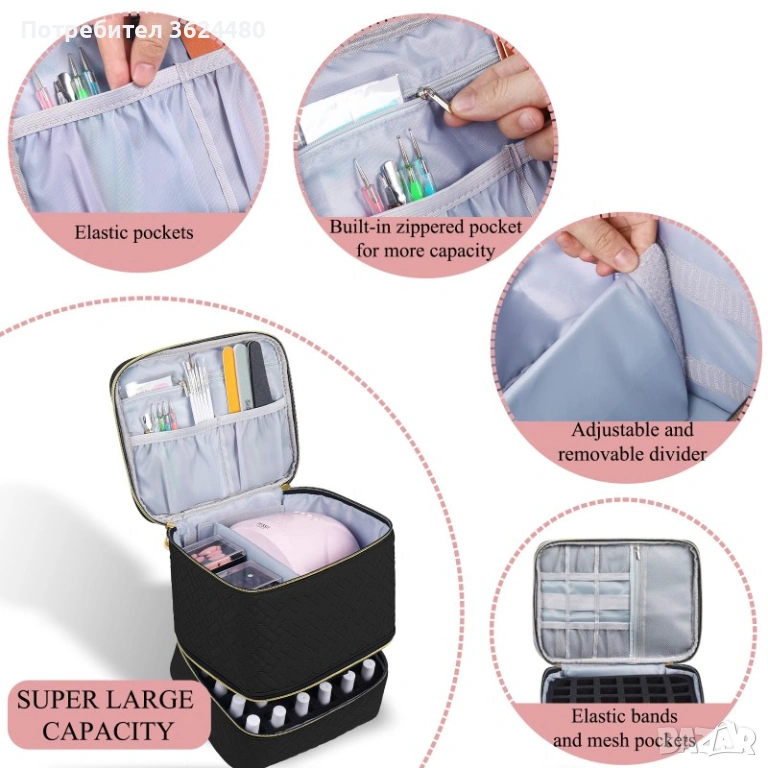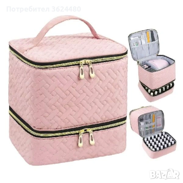 Тази двуслойна чанта тип куфар органайзер съчетава функционалност и компактност. Долното отделение е снабдено с защитна пяна за лакове, побираща точно 30 шишенца, докато горната част е предвидена за голямо отделение за лампа и мрежести джобове за пили, четки и инструменти. Материалът от висококачествен найлон/PU с капитонирана текстура осигурява не само здравина, но и професионален вид. Благодарение на размерите си от 25.4 х 23.88 х 21 см, чантата е лесна за пренасяне и побира всичко необходимо за перфектен маникюр навсякъде.