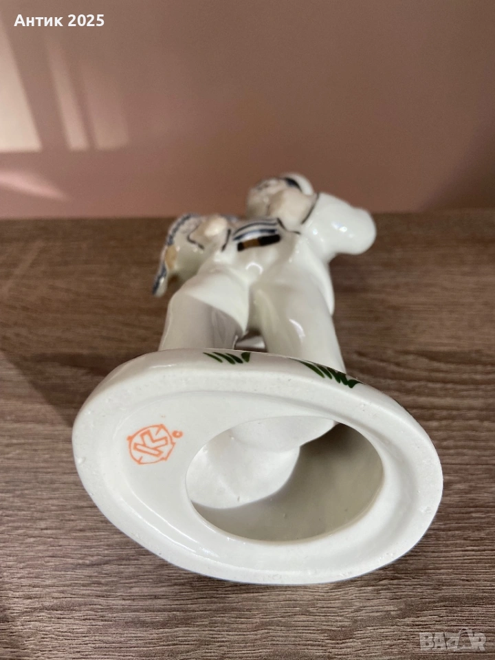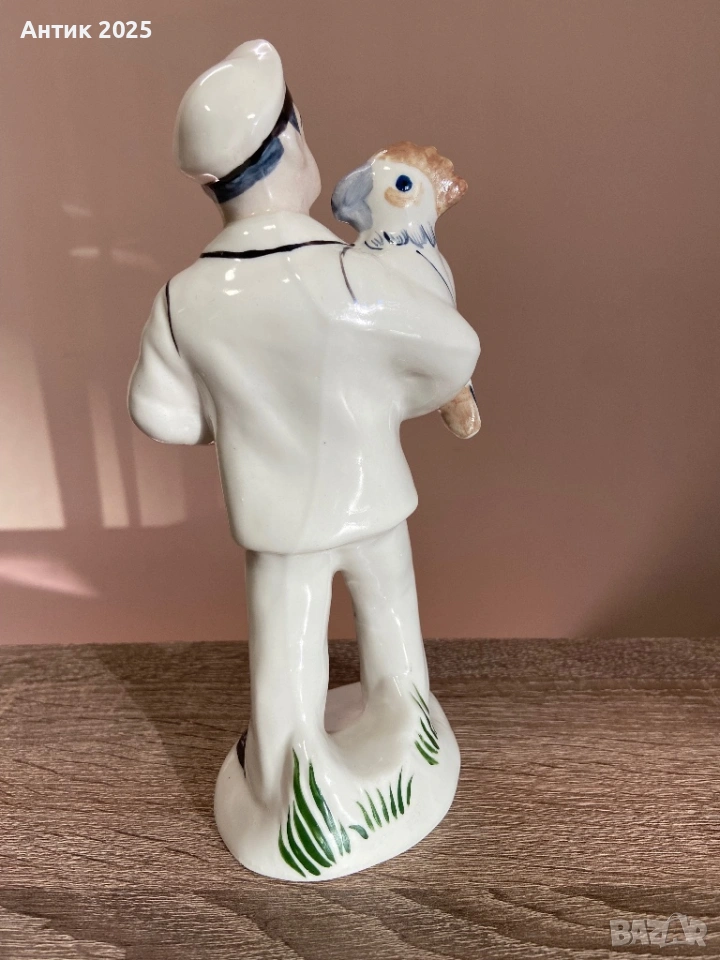 Винтидж порцеланова статуетка „Моряк с папагал“, произведена в Коростенския порцеланов завод (СССР). Фигура на моряк в традиционно облекло, държащ папагал – ярък и колоритен сюжет, характерен за съветската жанрова порцеланова пластика. Ръчна роспис, гланцирана глазура и изразителна проработка на детайлите и позата.