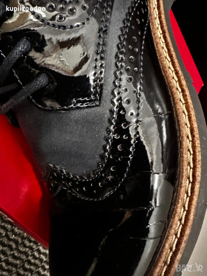 Имат захабяване по частта с лак отпред (обърнете внимание на снимките), тъй като лачената материя е твърда. Захабяването (гънките) по лачената материя е нормално и не би следвало да ви притеснява, ако имате опит с подобни материи.