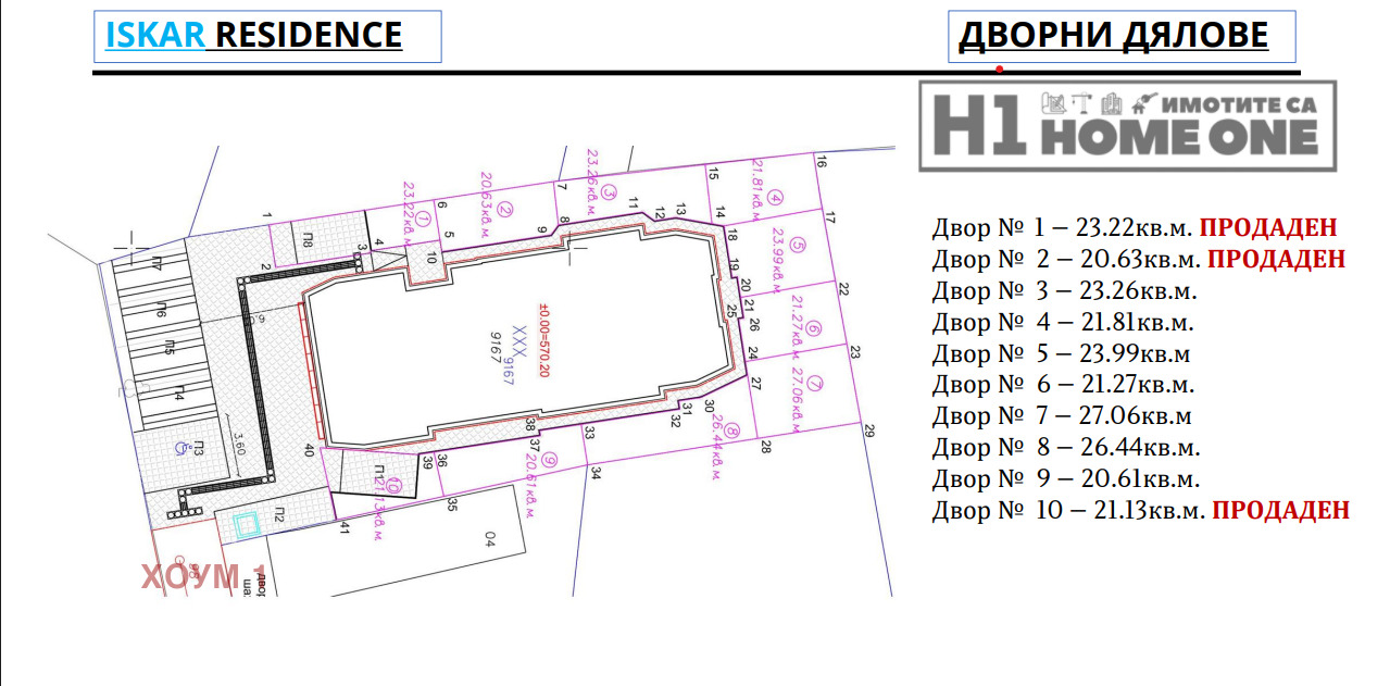 Към апартамента задължително се закупуват два двора: двор 9 20.61 кв.м. и Двор 10 е с включено паркомясто в него 21.13 кв.м.