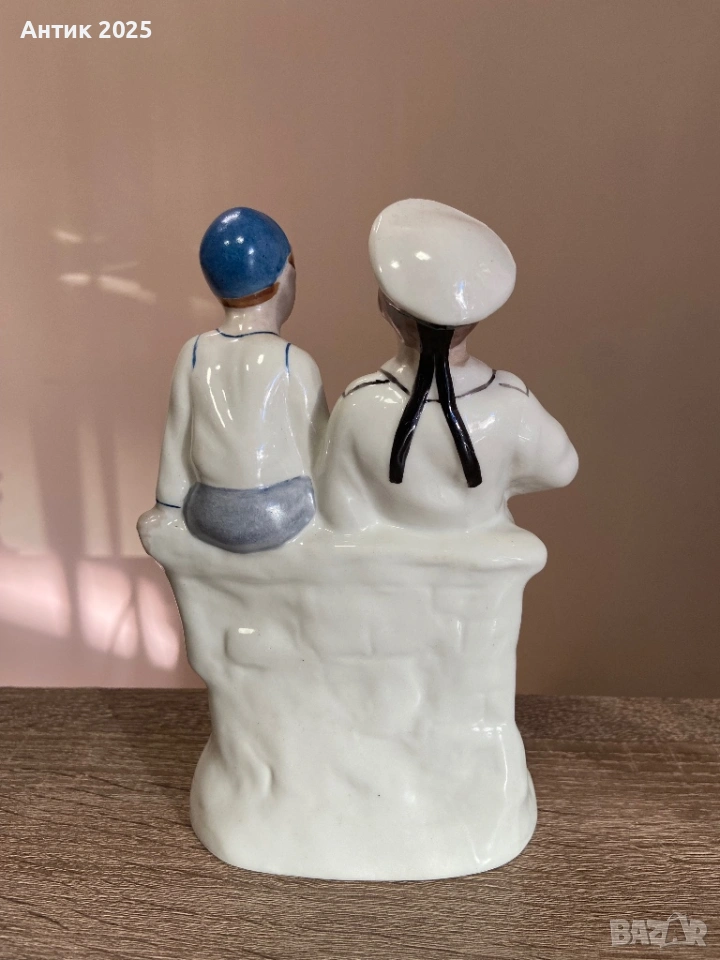 Винтидж порцеланова статуетка, изобразяваща двама млади моряци: единият стои, облечен в морска униформа с кинжал, а другият седи върху ниска зидана стена (или парапет), наподобяваща тухлена конструкция. Композицията създава усещане за разговор и приятелство, характерно за съветската жанрова порцеланова пластика. Ръчна роспис, гланцирана глазура и внимателно подчертани детайли на лицата и облеклото.