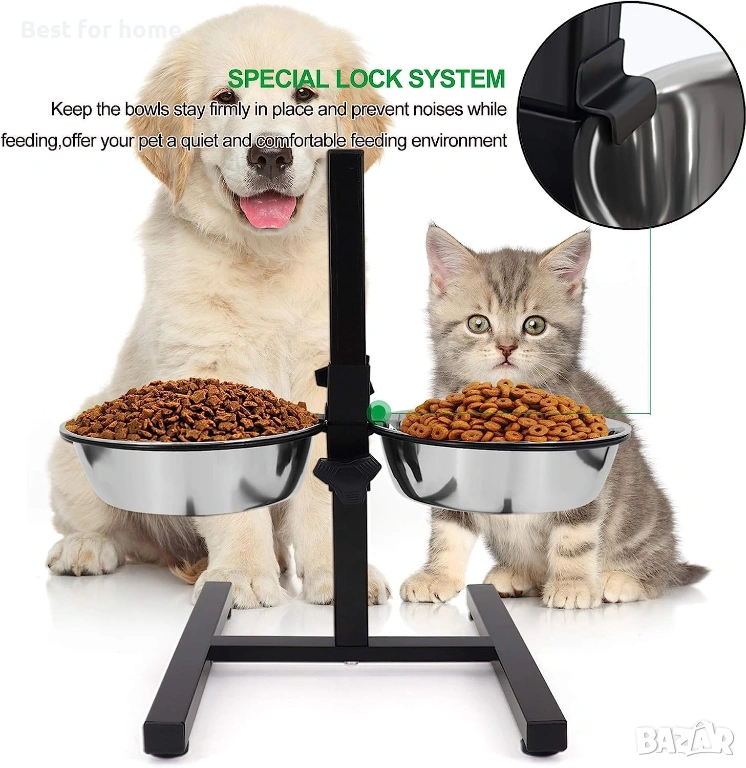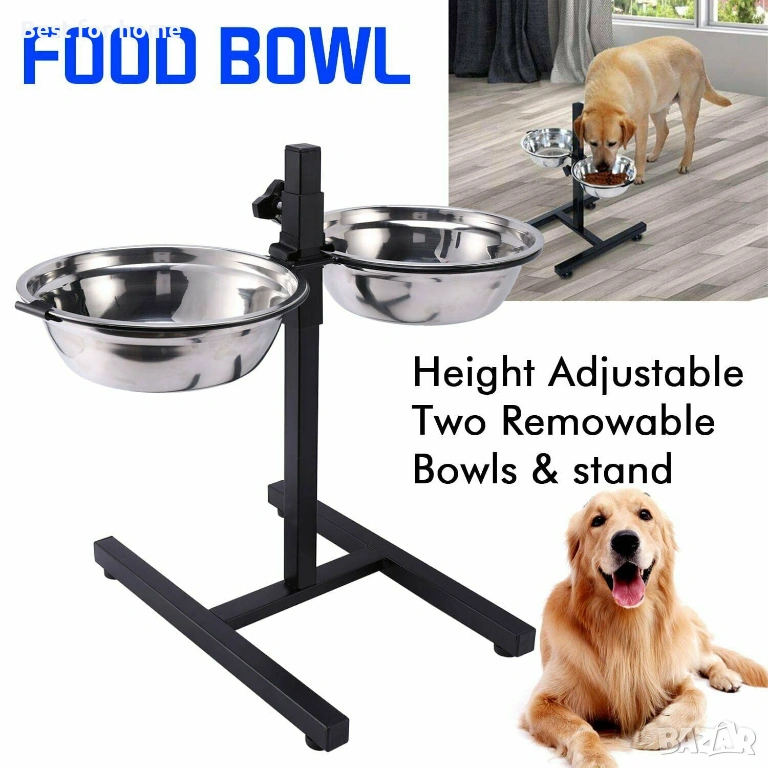 Две големи купички от неръждаема стомана: Тази хранилка е оборудвана с две големи купички от неръждаема стомана, всяка от които с вместимост от 1600 мл. Тези подвижни купички са идеални за осигуряване на достатъчно храна и вода за вашия домашен любимец, като гарантират, че той ще остане хидратиран и задоволен през целия ден.