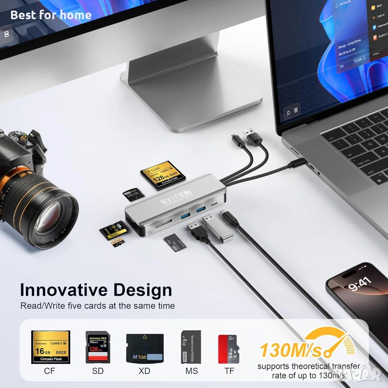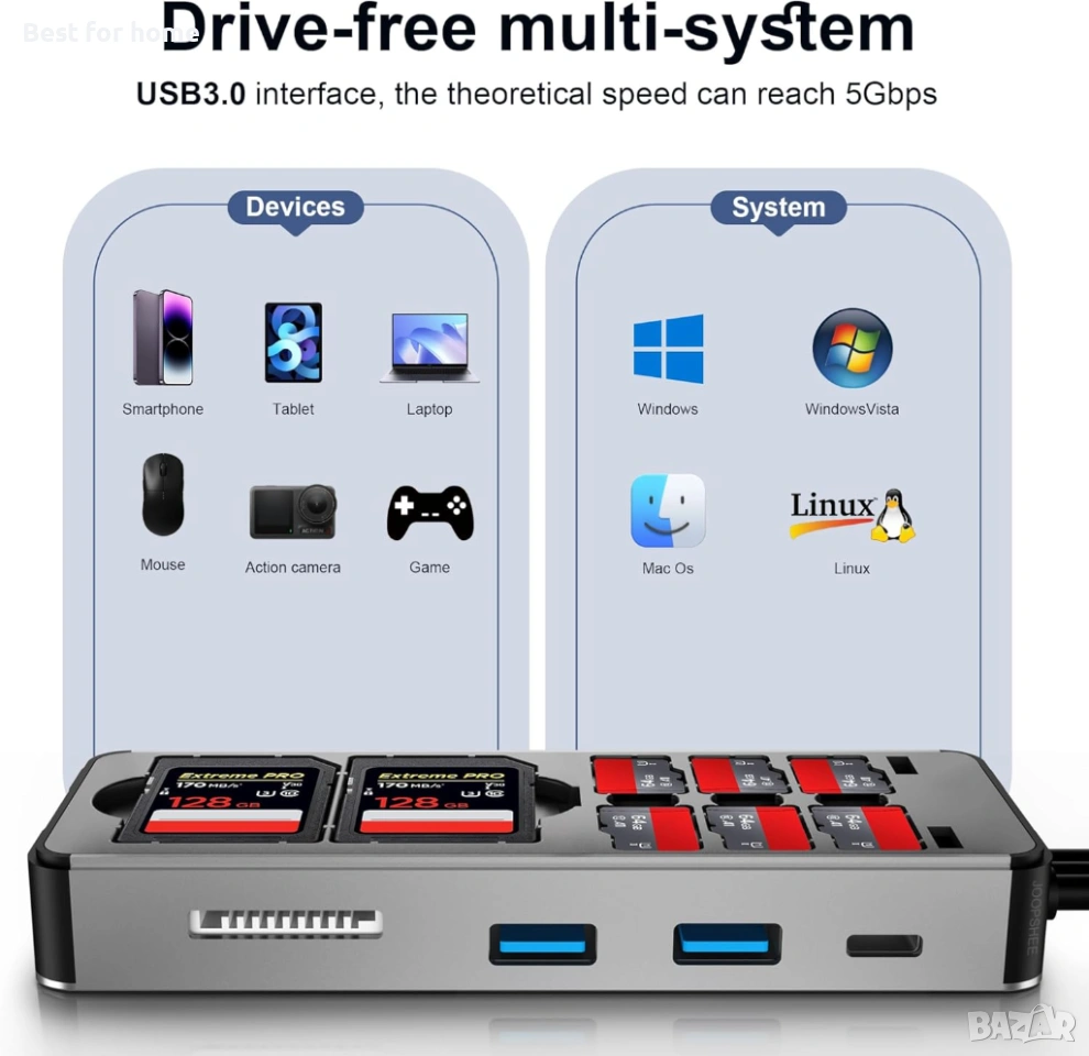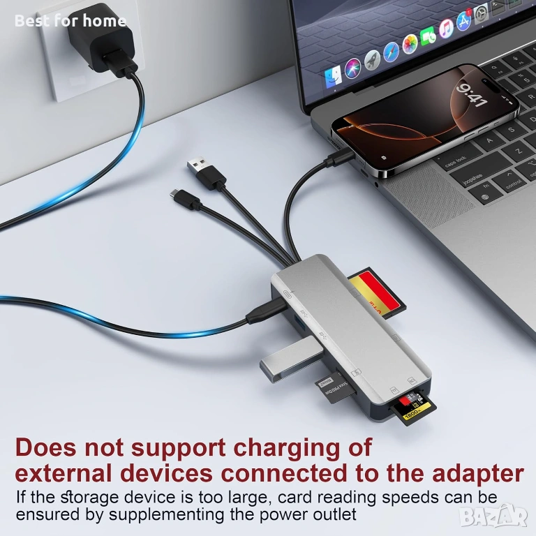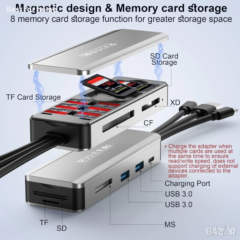 Многофункционалният четец на карти JOOPSHEE е мощно устройство, което може да чете различни видове карти с памет на различни устройства: TF/SD/CF/MS/XD, поддържа едновременно четене и е съвместимо с операционни системи Windows/Mac / Linux/iOS/OTG и Android. **Зареждайте адаптера, когато използвате няколко карти едновременно, за да осигурите скорост на четене/запис. Не поддържа зареждане на външни устройства, свързани към адаптера.