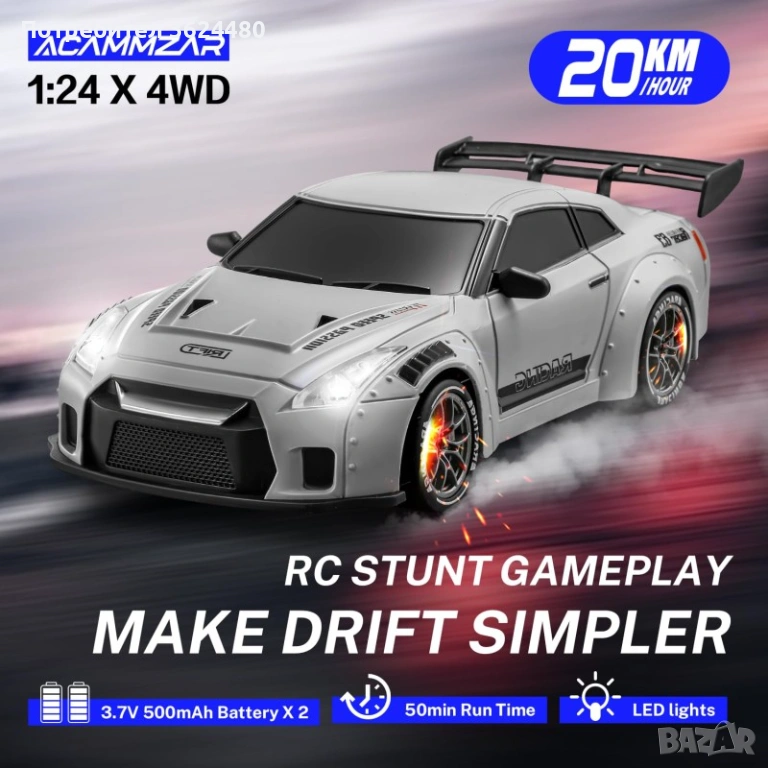 Комплект за дрифт: Получавате RC кола в сив цвят, дистанционно управление, акумулаторна батерия и USB кабел.
