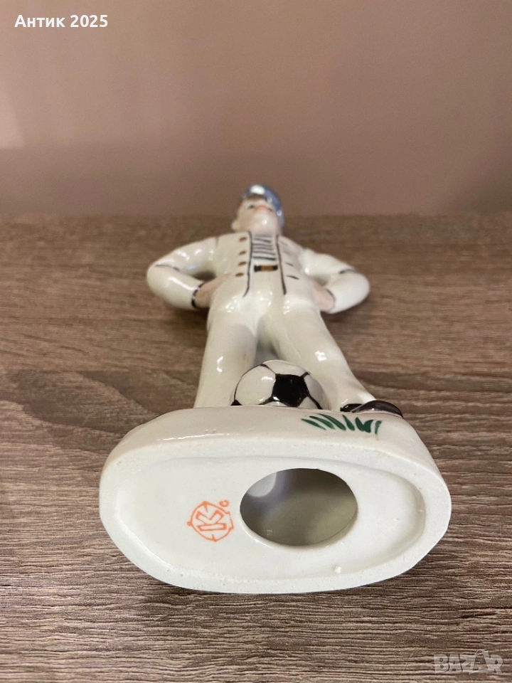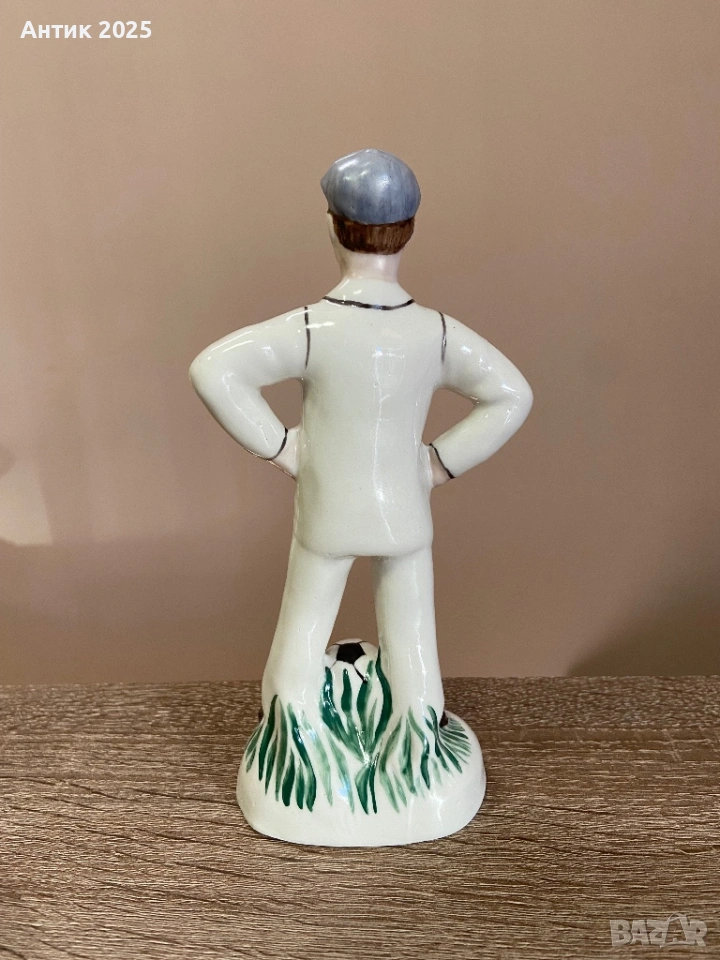 Винтидж порцеланова статуетка, изобразяваща момче, застанало уверено с ръце на кръста и футболна топка до краката си. Фигурата е облечена в светъл костюм и шапка, с характерни за съветската порцеланова пластика стилизирани пропорции. Ръчно рисувана, с гланцирана глазура и добре подчертани детайли на лицето, облеклото и топката.