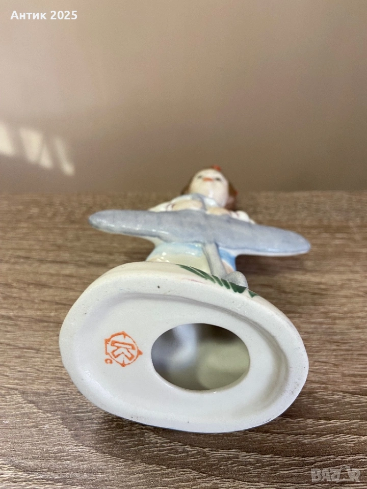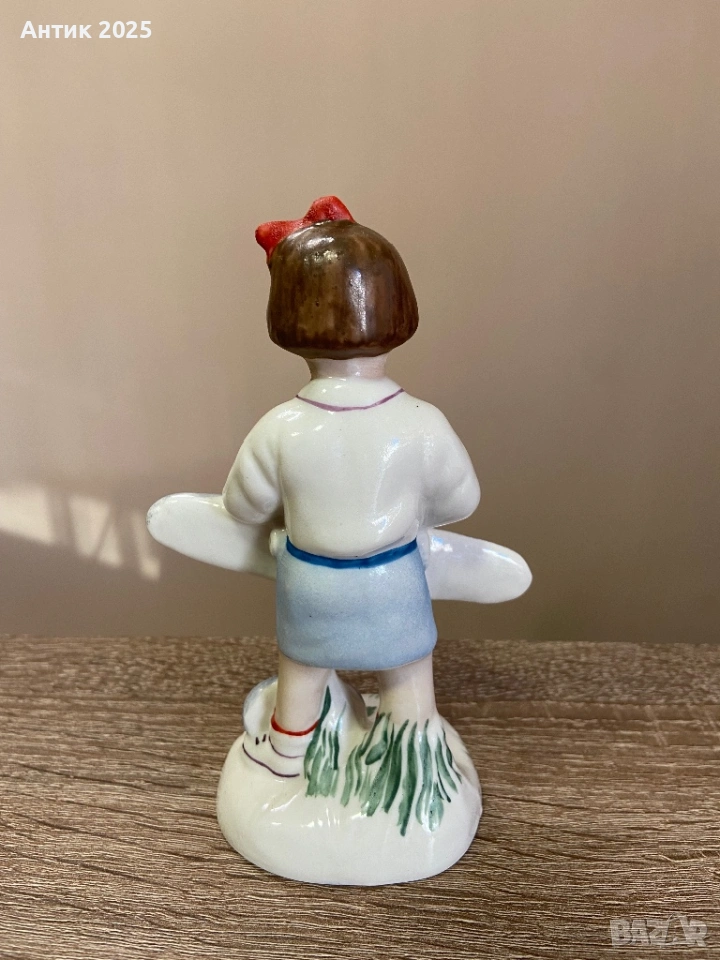 Винтидж порцеланова статуетка, изобразяваща момиче, държащо модел на самолет. Фигурата е изпълнена в жанров стил, характерен за съветския порцелан, и отразява темите за детството, мечтите и интереса към авиацията. Момичето е облечено в семпло ежедневно облекло, с подредена прическа и ярка панделка в косата.