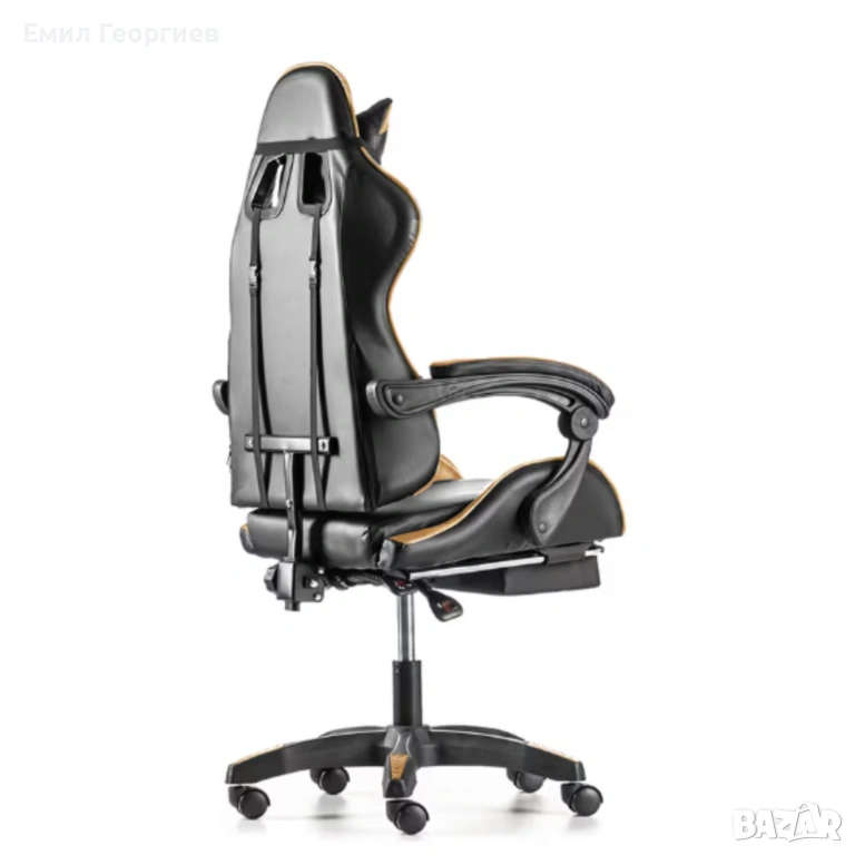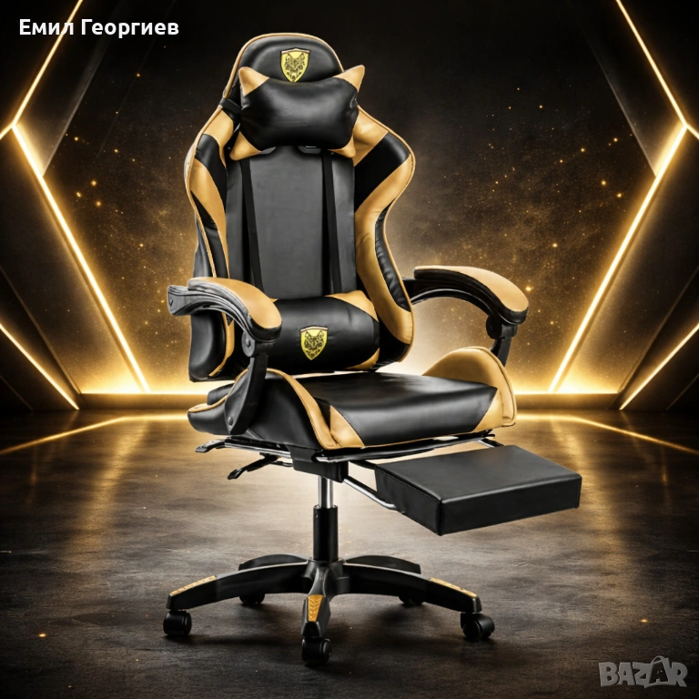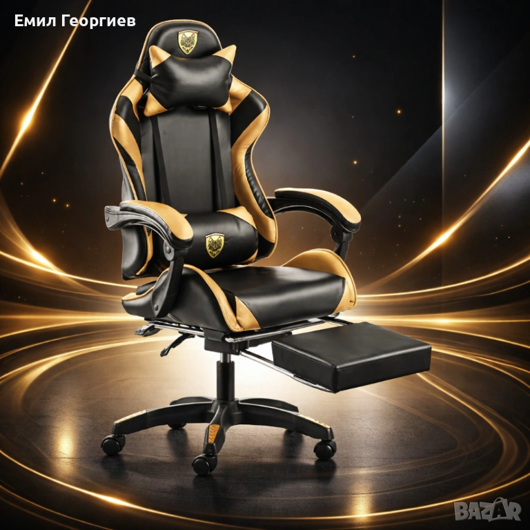 Черен геймърски стол с златисти акценти и разтегляема поставка за крака – луксозен комфорт без компр