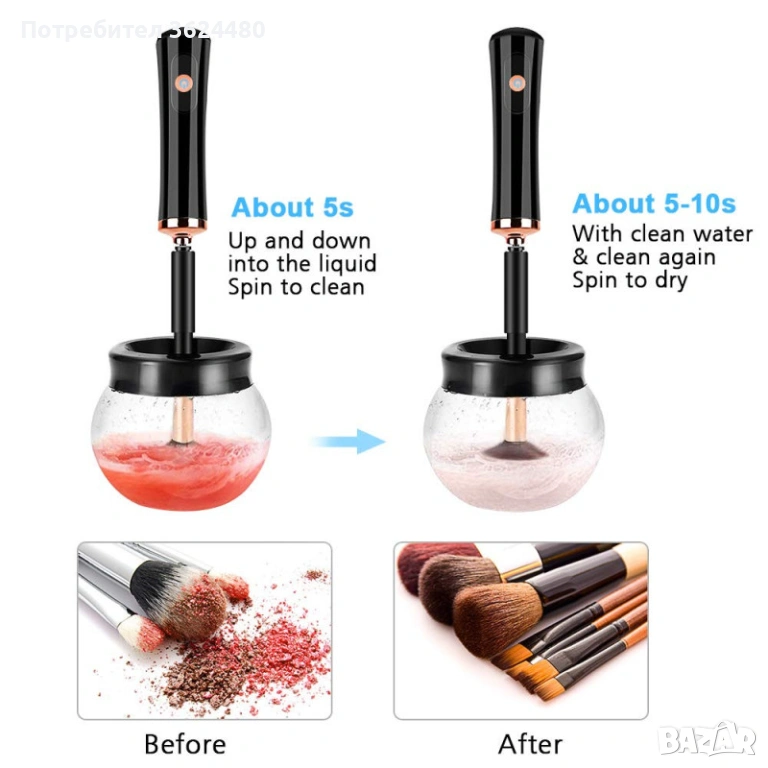 Само за няколко секунди четките ви се почистват в дълбочина и се подсушават чрез високоскоростно въртене. Забравете за бавното почистване на ръка и мокрите четки, които съхнат с часове.