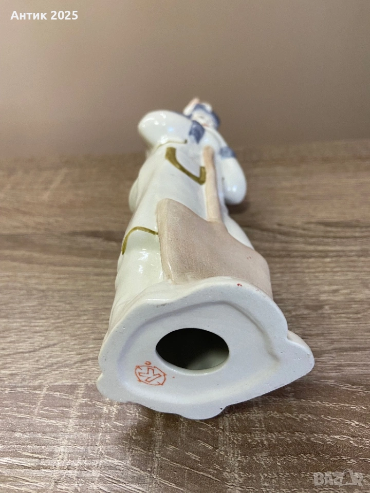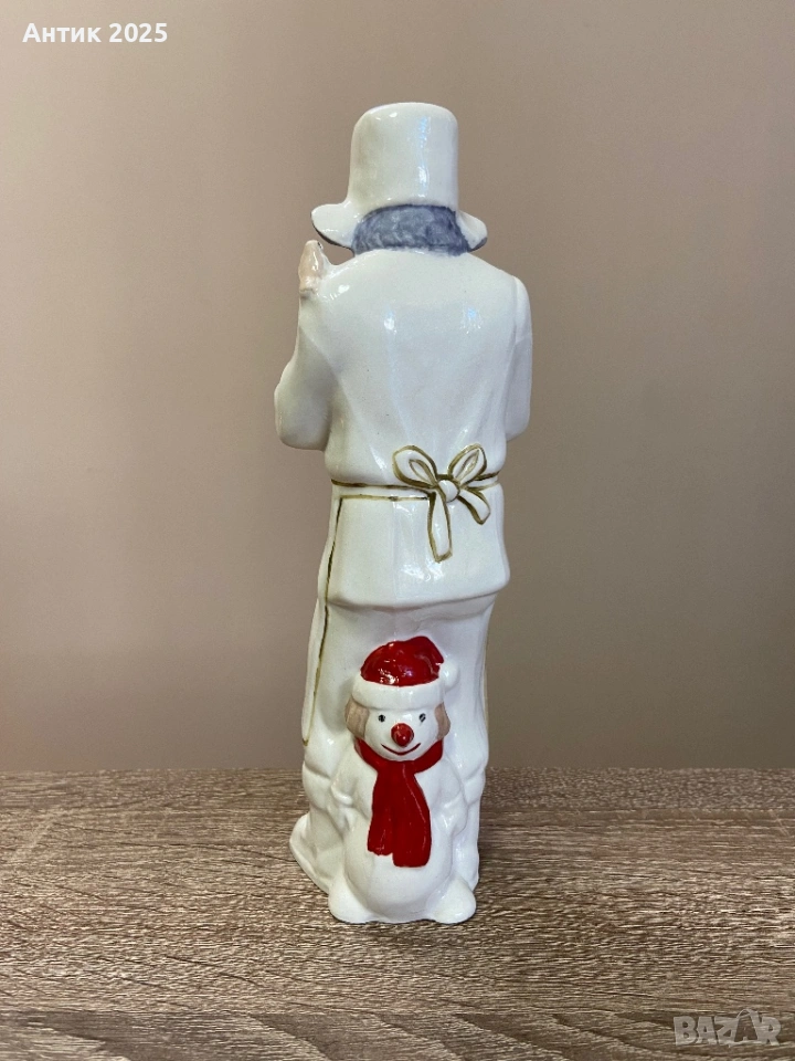 Порцеланова статуетка, изобразяваща зимен добър старец в дълго палто и шапка. В ръцете си държи лопата, а върху него са кацнали малки птички. Зад стареца е усмихнат снежен човек с червен шал. Сцената предава спокойно и топло зимно настроение от всекидневието. Ръчно рисувана, с добре изразени детайли и класическа форма.