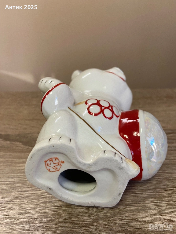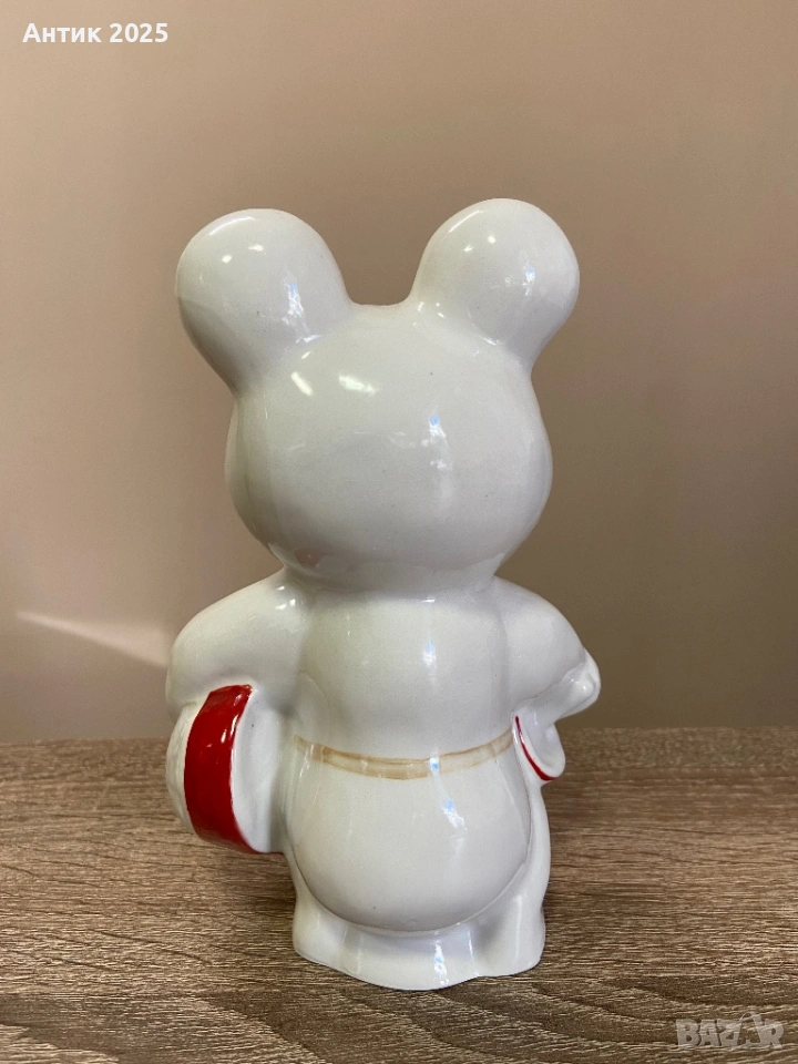 порцеланова статуетка, изобразяваща Олимпийското мече – един от най-разпознаваемите символи на Олимпиадата 1980 г. Фигурката е произведена в Коростенския порцеланов завод и се отличава с характерната за периода пластика и ръчна декорация.