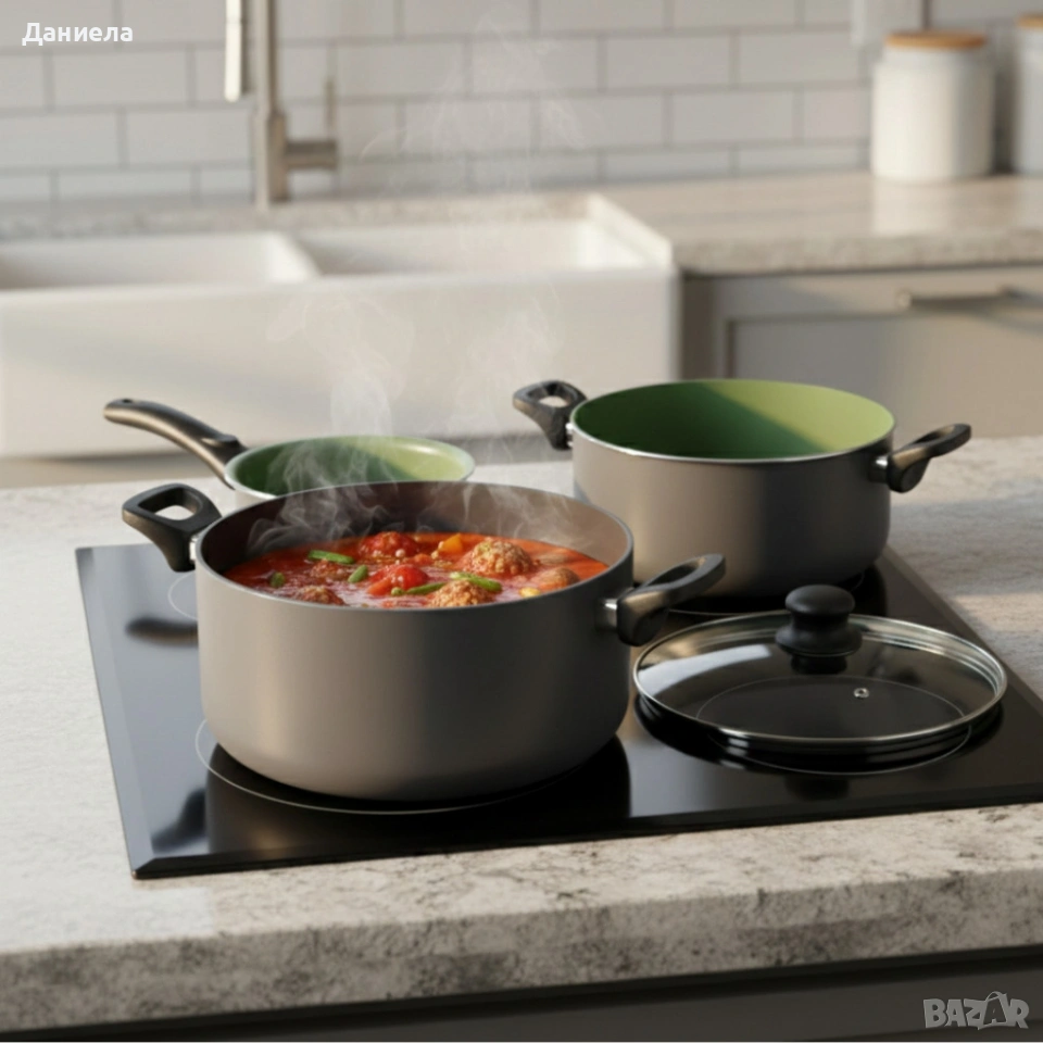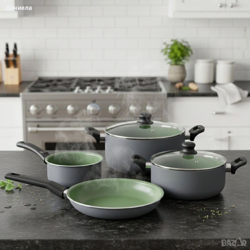 Материал: Алуминий; Размери: Касерола: 16 см; Тенджера: 20 см; Тенджера: 24 см; Тиган: 24 см; Покритие: Незалепващо Pfluon; Цвят: Сиво и зелено; Поддръжка: Лесно почистване, съвместим със съдомиялна машина; Капак: Стъклен с отвор за пара; Съвместимост: Подходящи за всички видове котлони, включително индукционни.