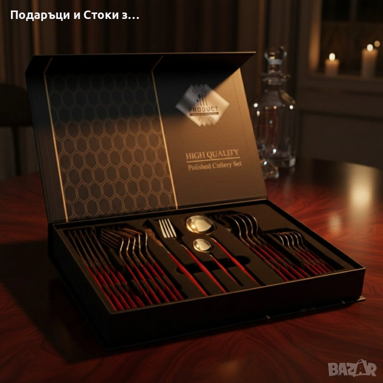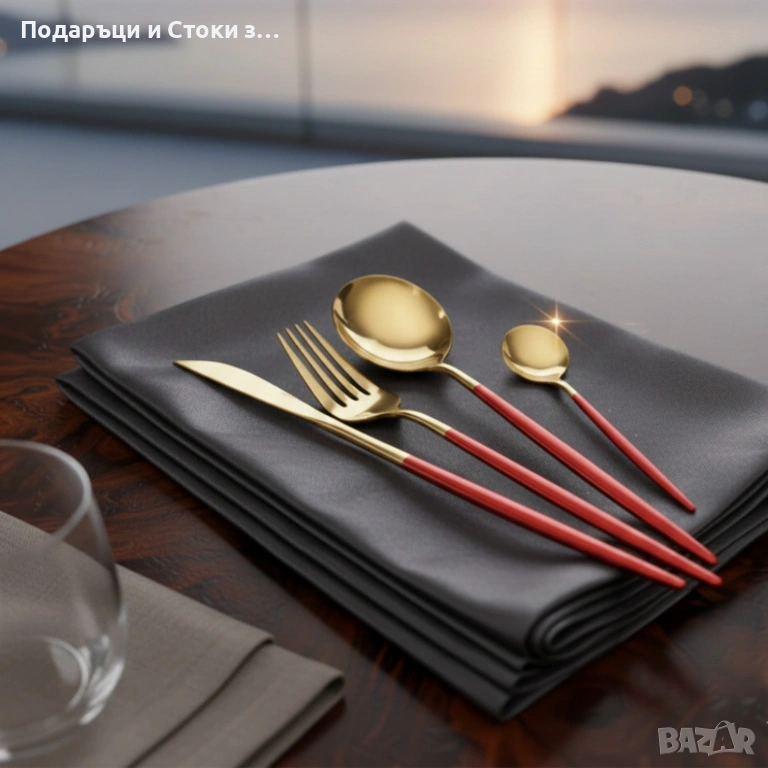 Комплект прибори за хранене от 24 части с луксозен дизайн и магнитна кутия златисто с червено KN2, снимка 1 - Прибори за хранене, готвене и сервиране - 53238107 Комплект прибори за хранене от 24 части с луксозен дизайн и магнитна кутия златисто с червено KN2, снимка 2 - Прибори за хранене, готвене и сервиране - 53238107 Комплект прибори за хранене от 24 части с луксозен дизайн и магнитна кутия златисто с червено KN2, снимка 3 - Прибори за хранене, готвене и сервиране - 53238107 Комплект прибори за хранене от 24 части с луксозен дизайн и магнитна кутия златисто с червено KN2, снимка 4 - Прибори за хранене, готвене и сервиране - 53238107 Комплект прибори за хранене от 24 части с луксозен дизайн и магнитна кутия златисто с червено KN2, снимка 5 - Прибори за хранене, готвене и сервиране - 53238107 1/5