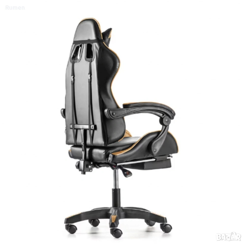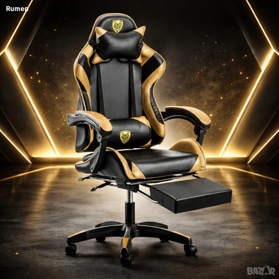 Черен геймърски стол с златисти акценти и разтегляема поставка за крака → Обява 53238169