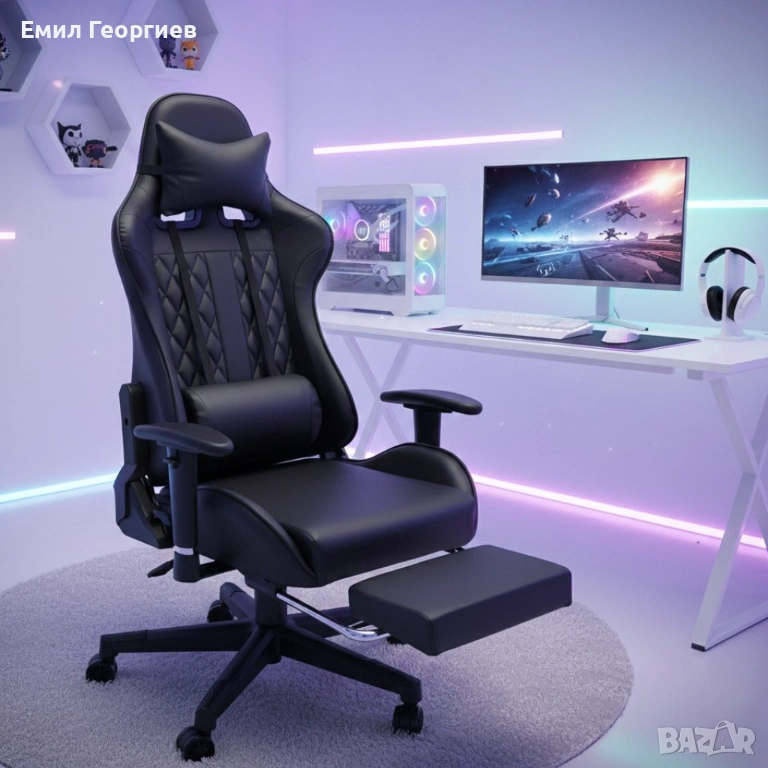 Геймърски стол с прибираща се подложка за крака и функция за масаж - черен → Обява 53238212