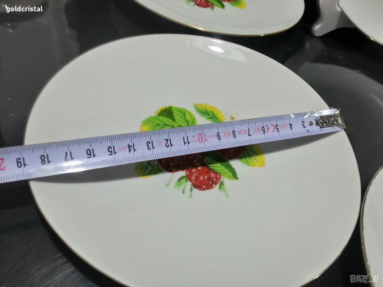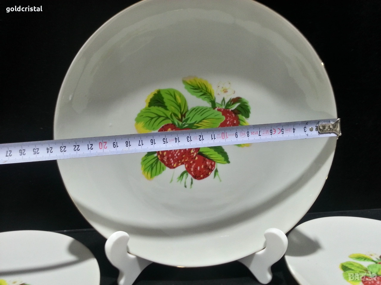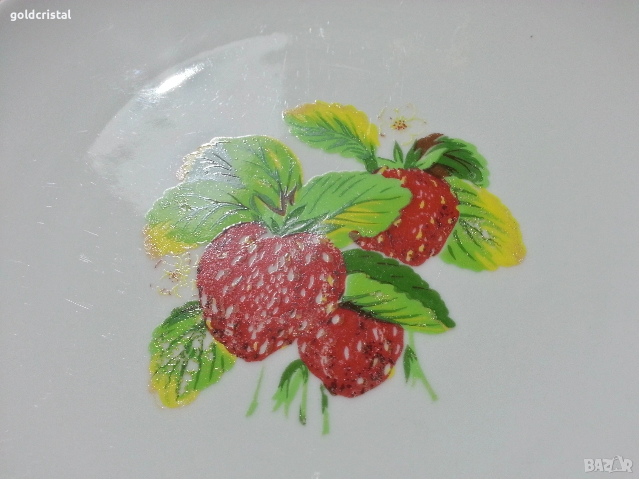 Стар български порцелан чинии с ягоди 4 бр чинии и едно кръгло плато златен кант сервиз комплект сет лот ретро арт декор винтидж колекция стари старинни антикварни предмети обзавеждане за дома и семейството подходящи за подарък за ценители и колекционери
