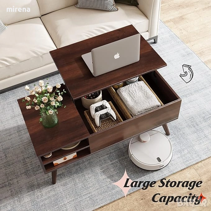 Холна масичка с повдигащ се плот за хол, малка холна масичка с място за съхранение, скрито отделение и регулируем рафт, модерен стил от средата на века, дърво, череша, еспресо.