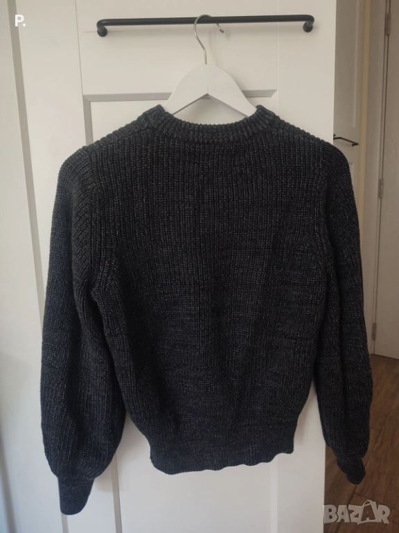 Дамски плетен пуловер, размер S, в много добро състояние. Единствените забележки са няколко леко разнищени сребърни нишки, една от които е видима на последната снимка.