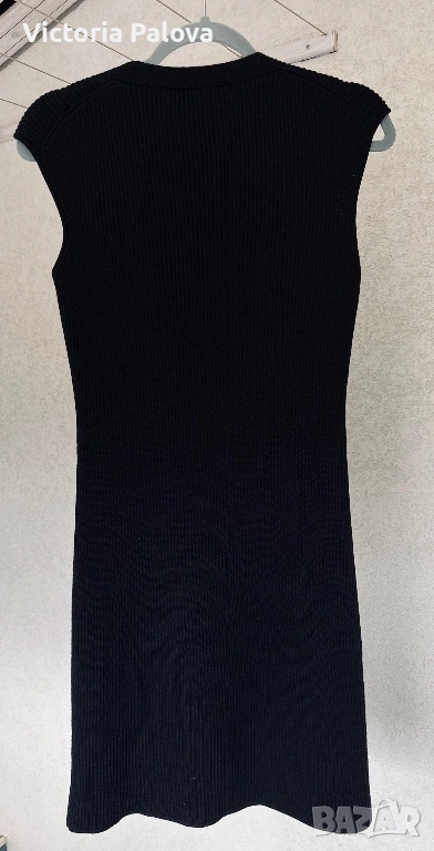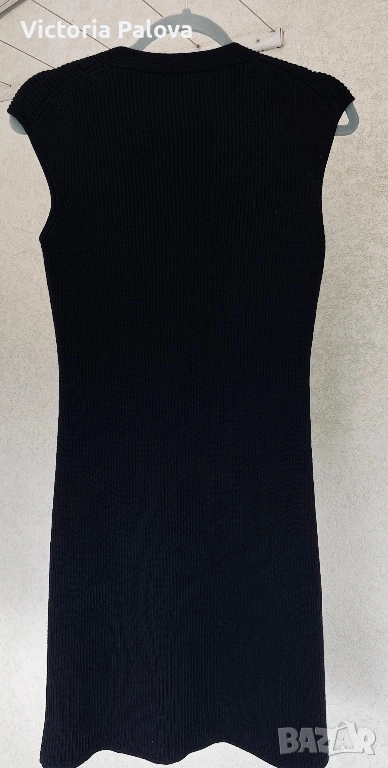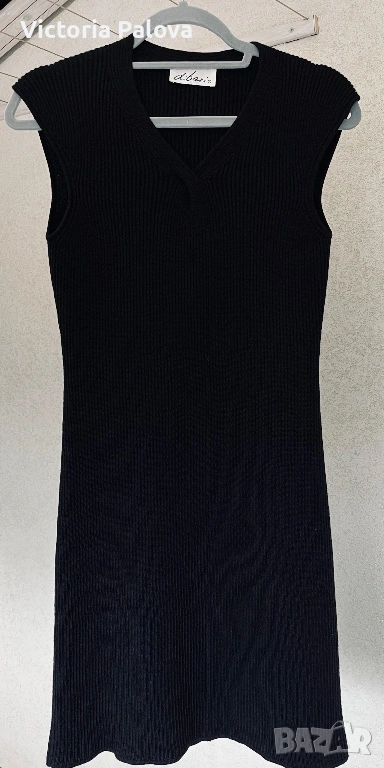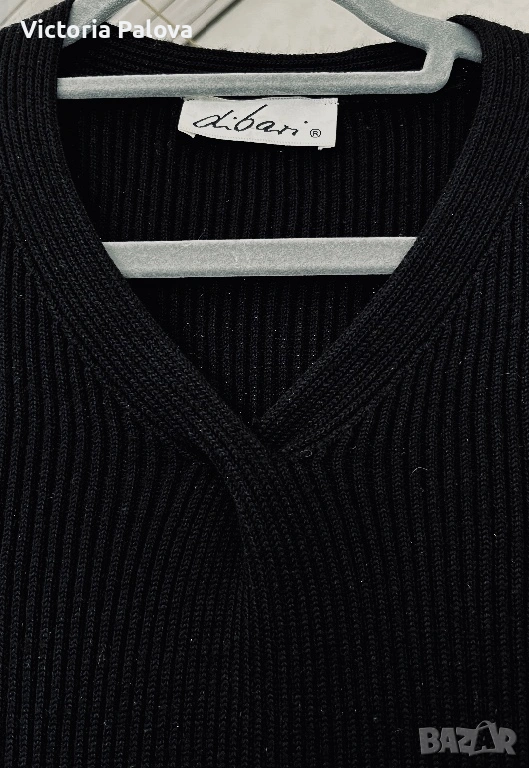 Елегантна черна рокля без ръкави на италианска марка DIBARI, изработена от 100% жива вълна - първична вълна от най- висок клас, отличаващата се с изключителна мекота, плътност и дълготрайност. Материята е гладка, осезаемо тежка и естествено разтеглива, следва тялото с фин , контролиран пад, като запазва формата си и създава усещане за истински лукс. Вертикалното рипсено плетиво и елегантното V-образно деколте издължават силуета и придават чиста, интелигентна линия с характерната за италианския дизайн сдържана елегантност. Това е минималистичен модел, който не разчита на ефекти, а на качество, материя и конструкция - рокля, която стои еднакво убедително самостоятелно или в комбинация със сако, дълъг кардиган или кожено яке. Нов такъв модел се позиционира в ценови диапазон от 180- 250€. Рамо - 44см, ГО - 42см, дължина - 92см.