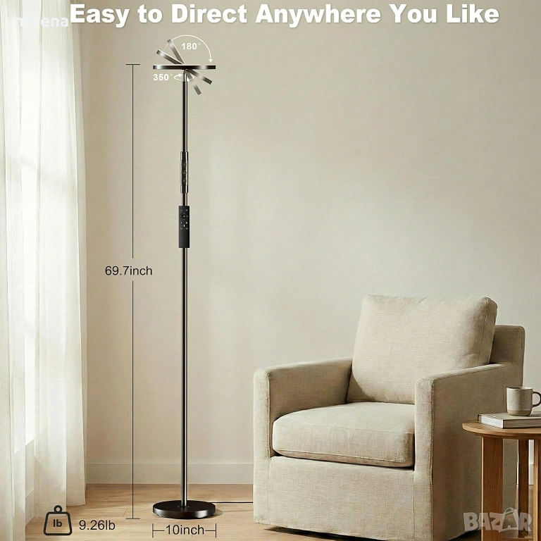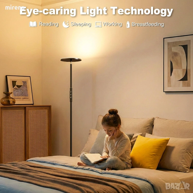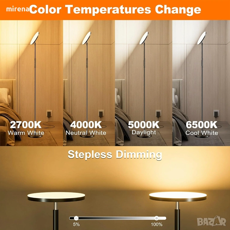 Безстепенно затъмняване и супер яркост и грижа за очите: Тази LED подова лампа на Yikuneng поддържа безстепенно затъмняване на яркостта (5%-100%) и цветната температура (2700K-6500K). Това е супер ярка подова лампа с 3200 лумена, осигуряваща достатъчно осветление за вашата всекидневна или спалня. Независимо дали четете или работите, стоящата лампа осигурява мека светлина без сини лъчи, която не вреди на очите ви.