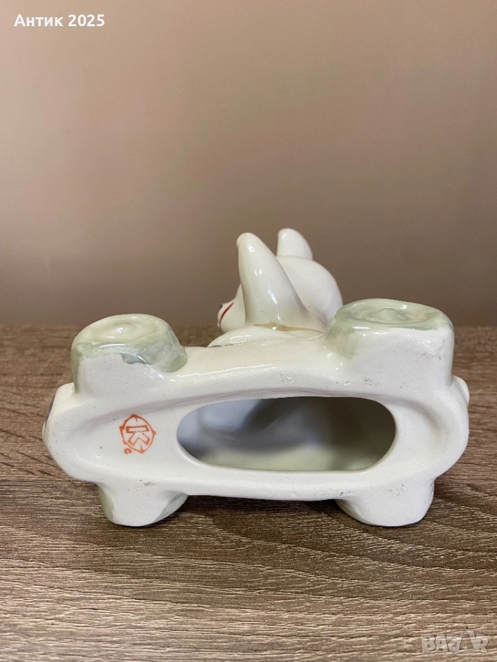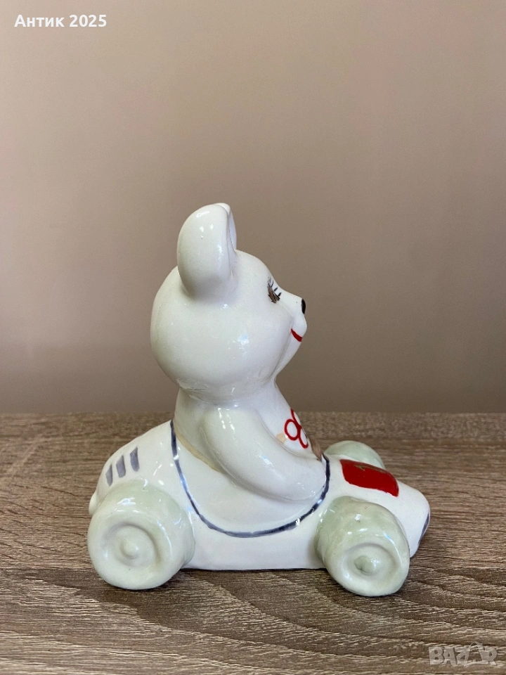 Порцеланова статуетка „Олимпийското мече в състезателен автомобил“ — Коростен, винтидж