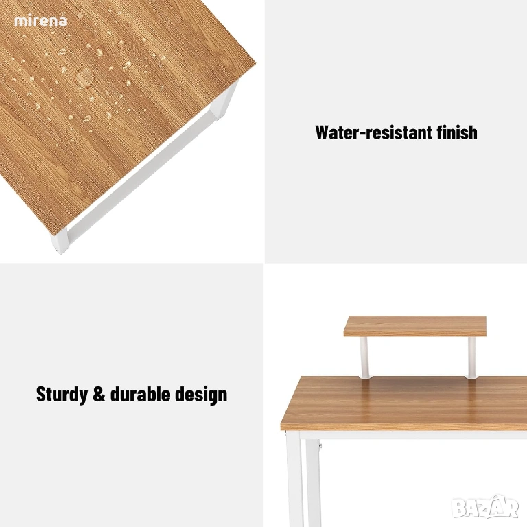 Здрави материали: Това компютърно бюро е изработено от масивна дървесна дървесина със сертификат E1 и има здрава метална рамка, проектирана да бъде устойчива на надраскване и износване. Защитните подложки на краката предотвратяват надраскване на пода и минимизират шума, което го прави идеално допълнение към всеки домашен офис или работно пространство. Насладете се на комбинация от стил и функционалност с това многофункционално бюро.